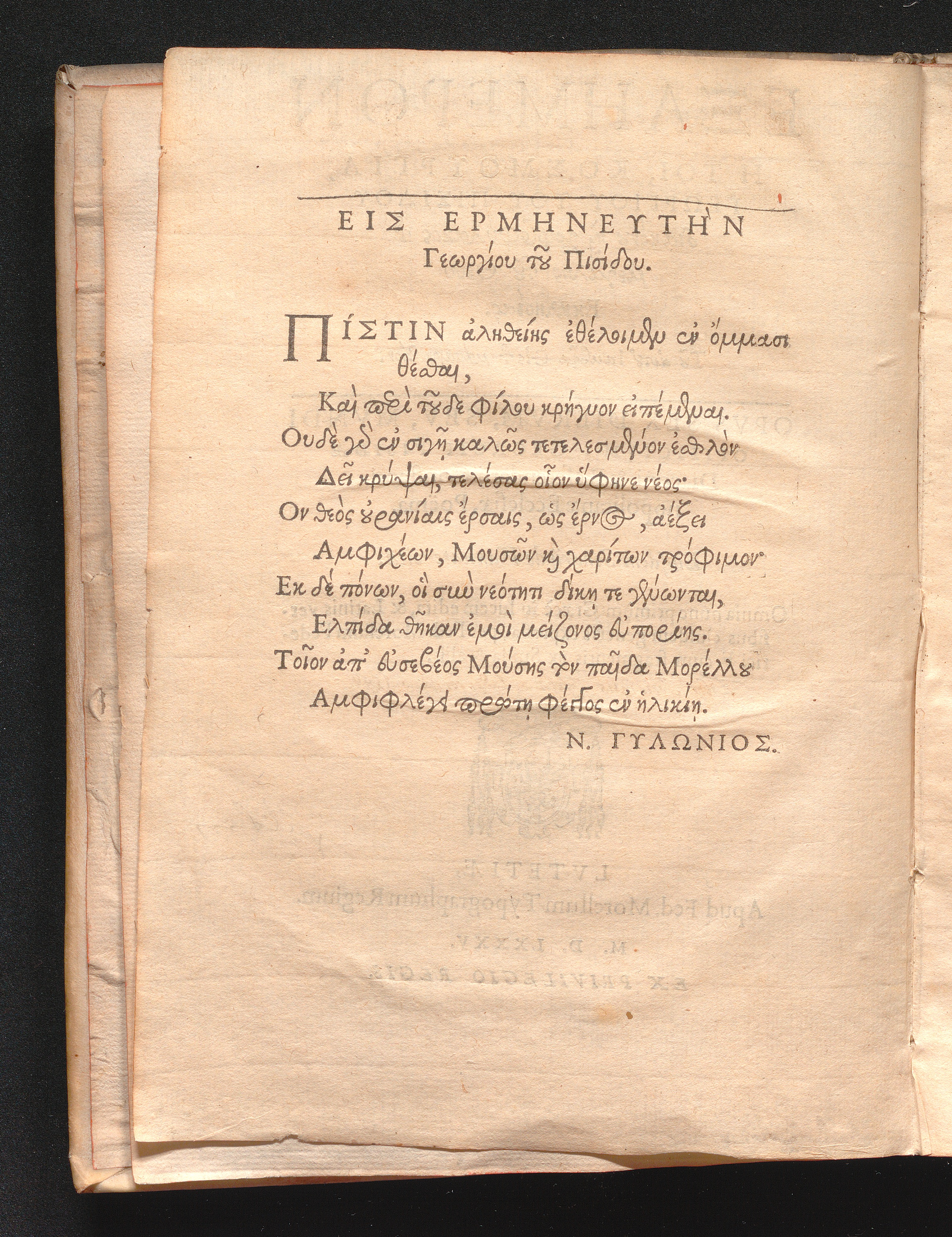 Hexaēmeron Hē Toi, Kosmourgia, Georgiou tou Pisidou diakonou ... / Omnia nunc primùm Græcè in lucem edita, & Latinis versibus eiusdem generis expressa, per Fed. Morellum Federici F. cum fragmentis ex Suida & aliis