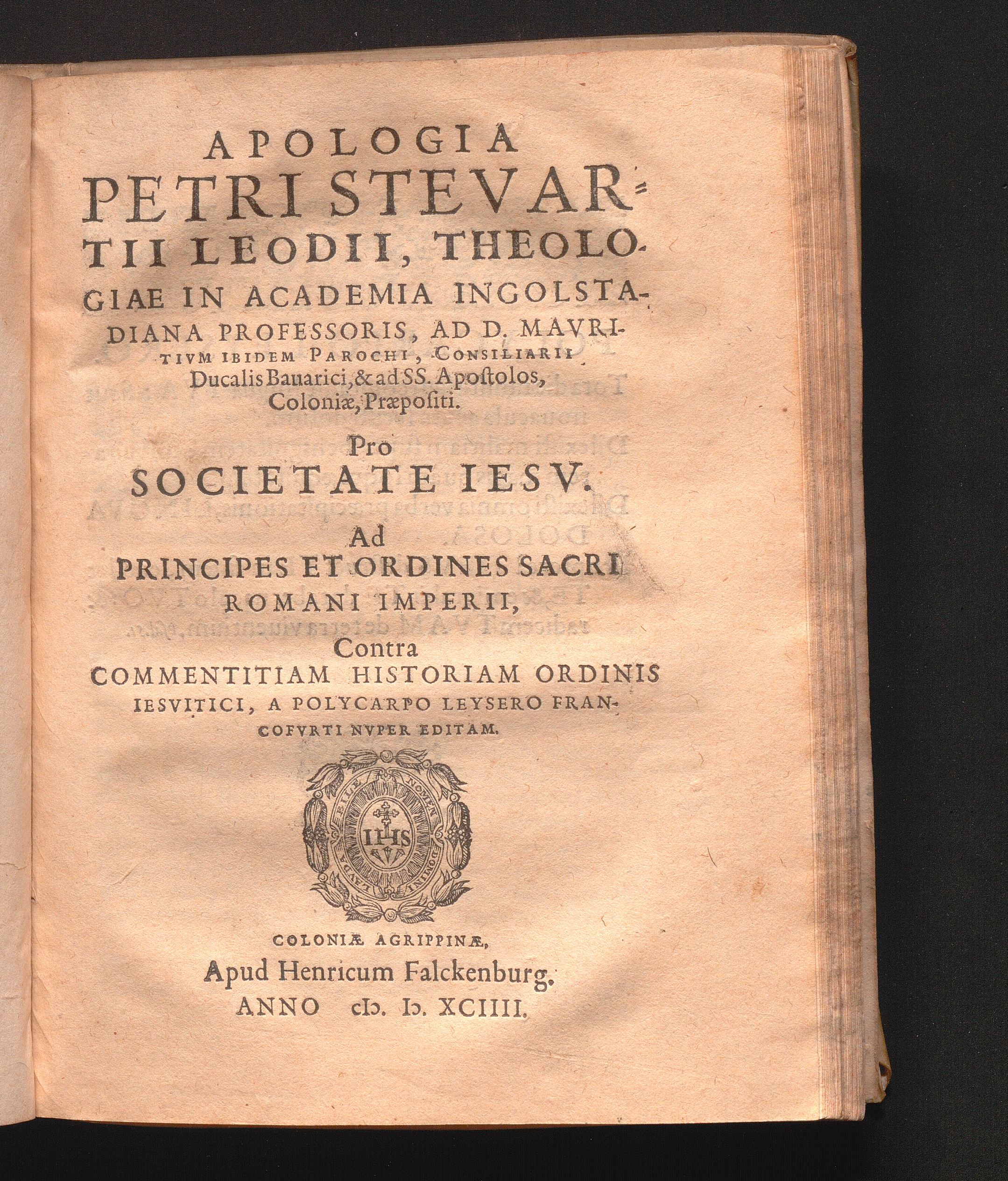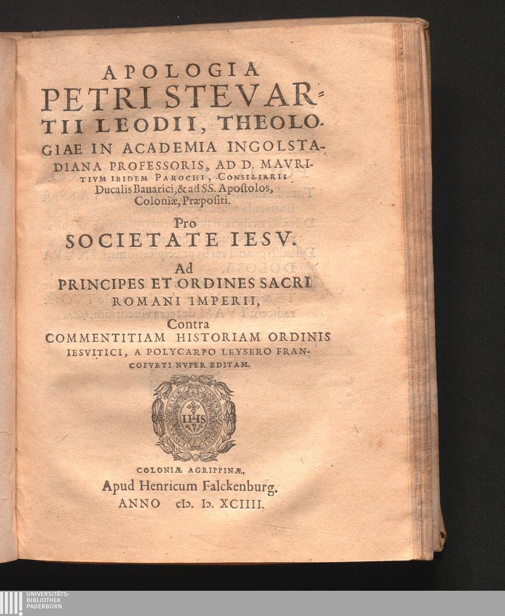 Apologia Petri Stevartii Leodii, Theologiae In Academia Ingolstadiana Professoris, Ad D. Mavritivm Ibidem Parochi, Consiliarii Ducalis Bauarici, & ad SS. apostolos, Coloniæ, Præpositi. Pro Societate Iesv : Ad Principes Et Ordines Sacri Romani Imperii, Contra Commentitiam Historiam Ordinis Iesvitici, A Polycarpo Leysero Francofvrti Nvper Editam
