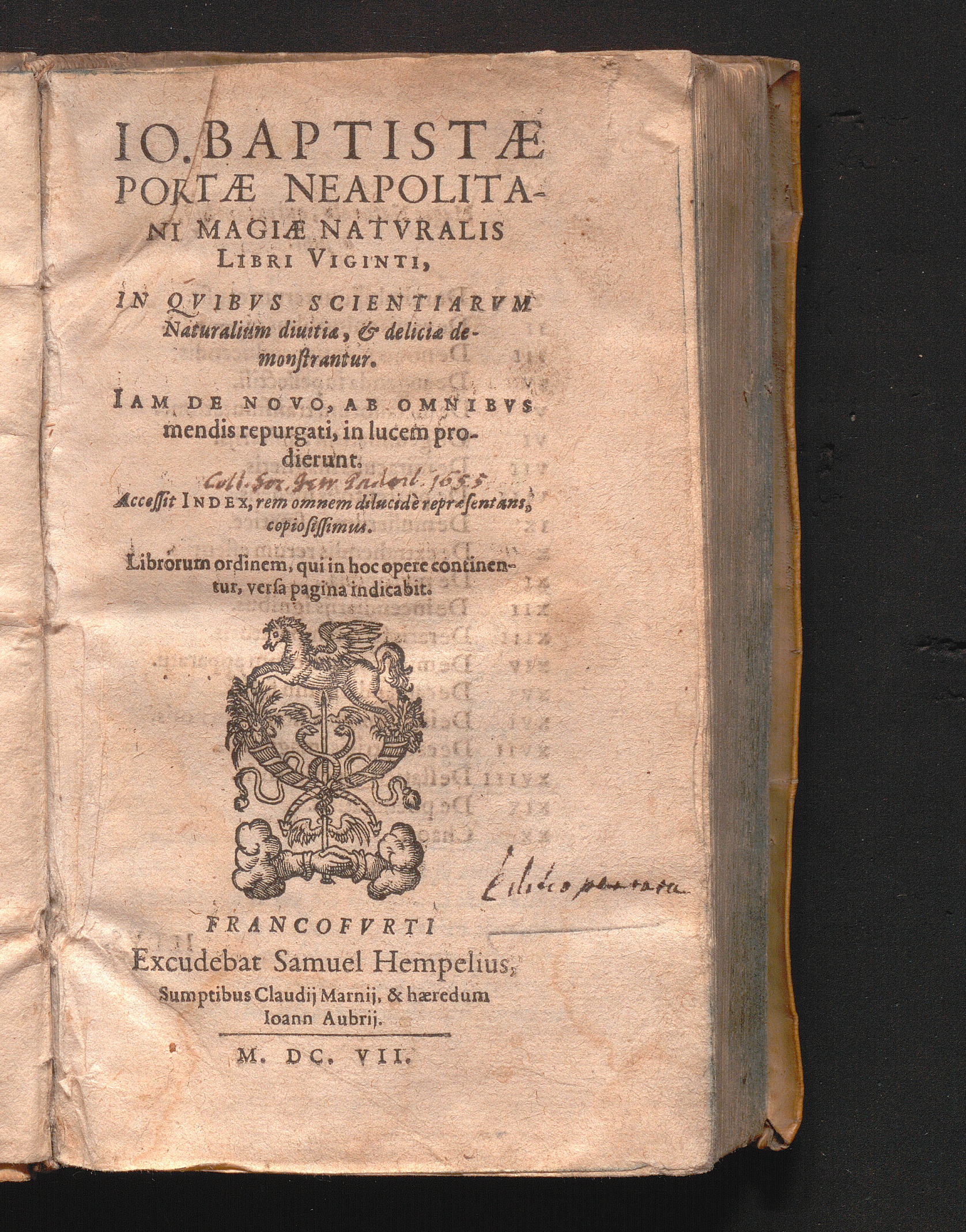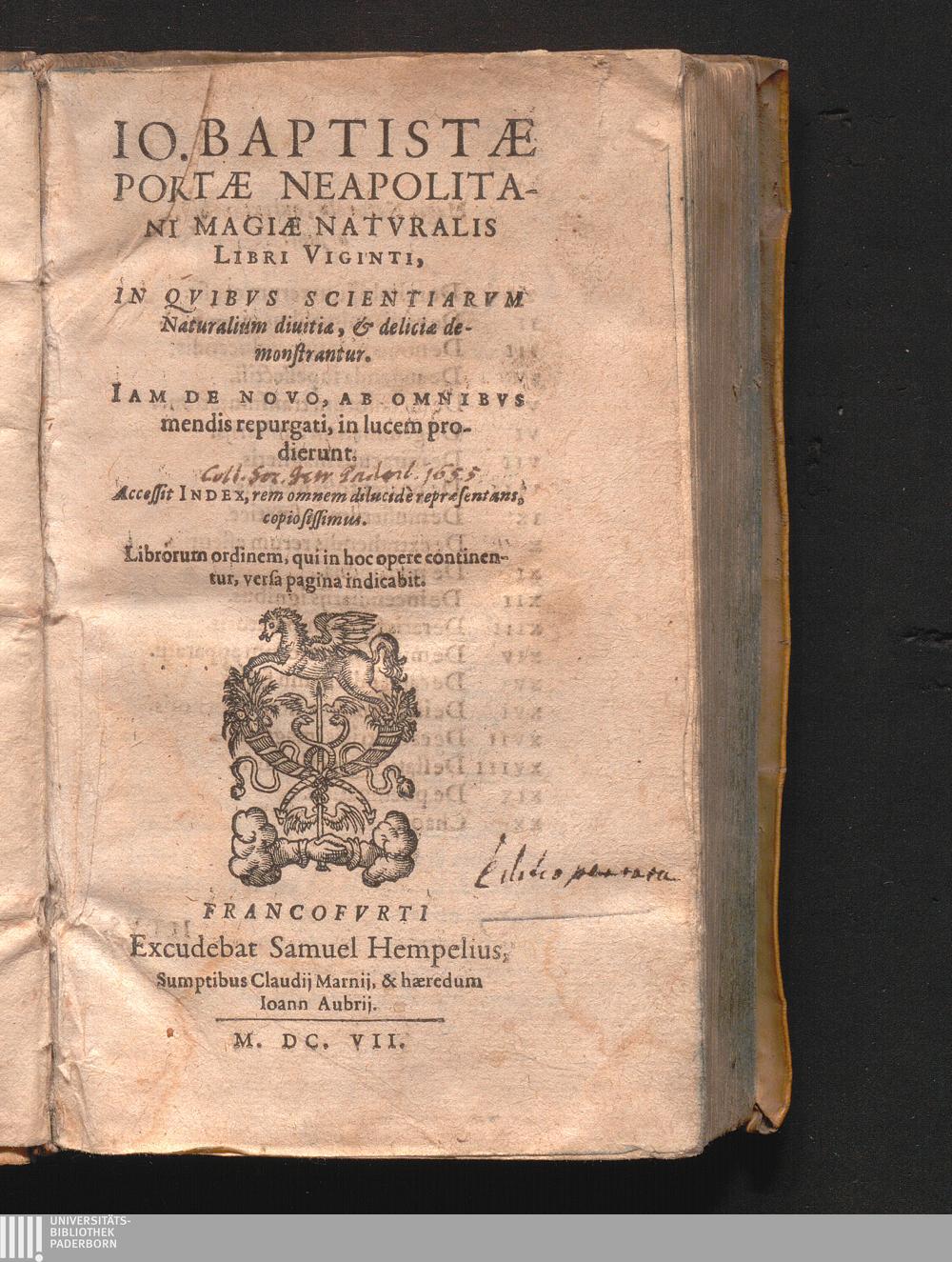 Io. Baptistæ Portæ Neapolitani Magiæ Naturalis Libri Viginti : In Quibvs Scientiarvm Naturalium divitiæ, & deliciæ demonstrantur ; Accessit Index, rem omnem dilucidè repræsentans, copiosissimus. Librorum ordinem, qui in hoc opere continentur, versa pagina indicabit