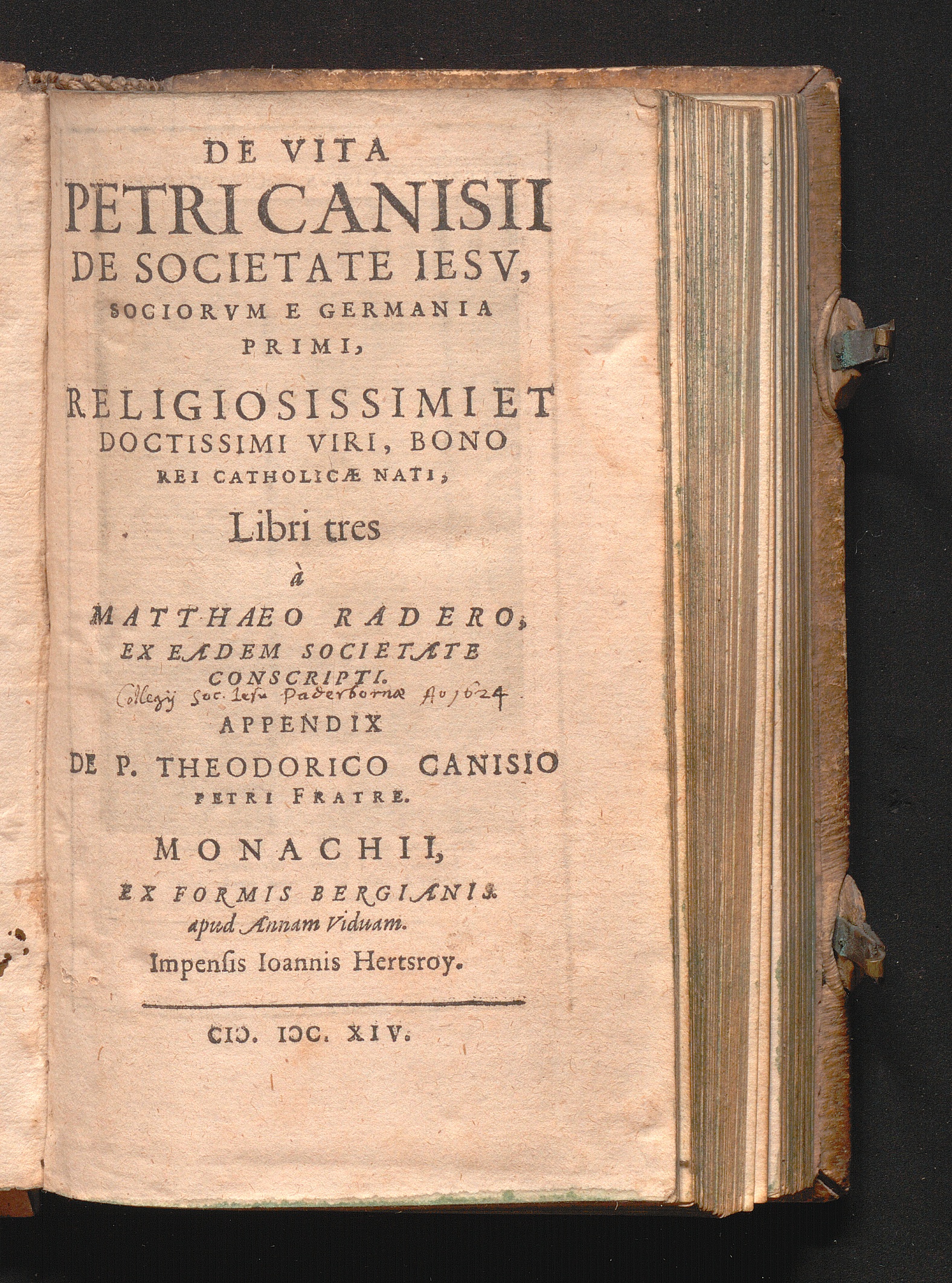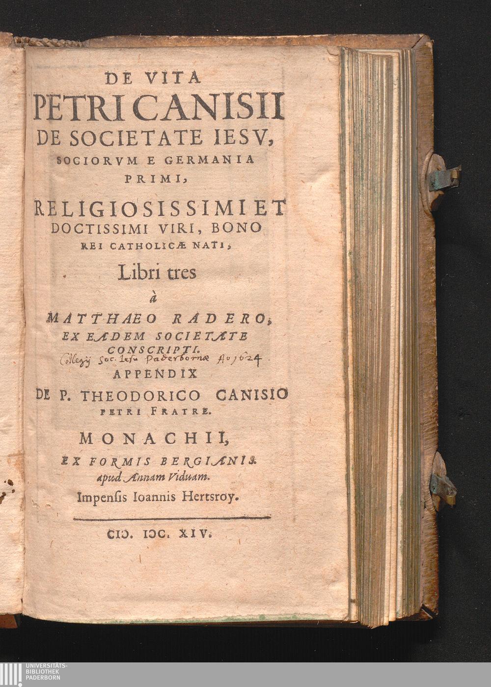 De Vita Petri Canisii De Societate Iesv : Sociorvm E Germania Primi, Religiosissimi Et Doctissimi Viri, Bono Rei Catholicæ Nati, Libri tres / à Matthaeo Radero, Ex Eadem Societate Conscripti