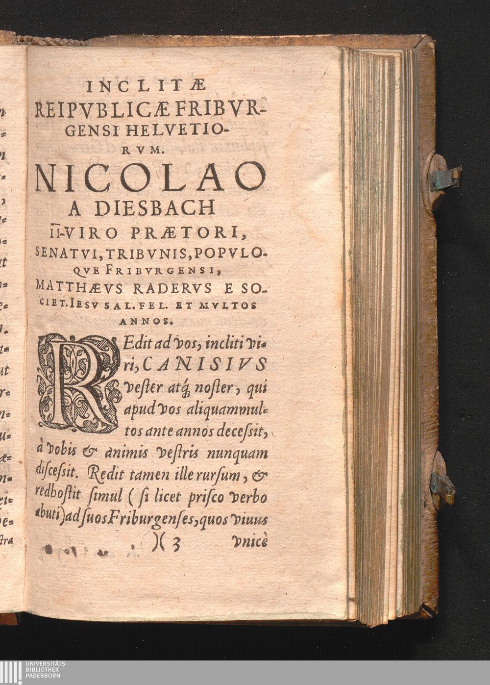 Inclitæ Reipvblicæ Fribvrgensi Helvetiorvm. Nicolao A Diesbach Viro Prætaori, Senatvi,[...]