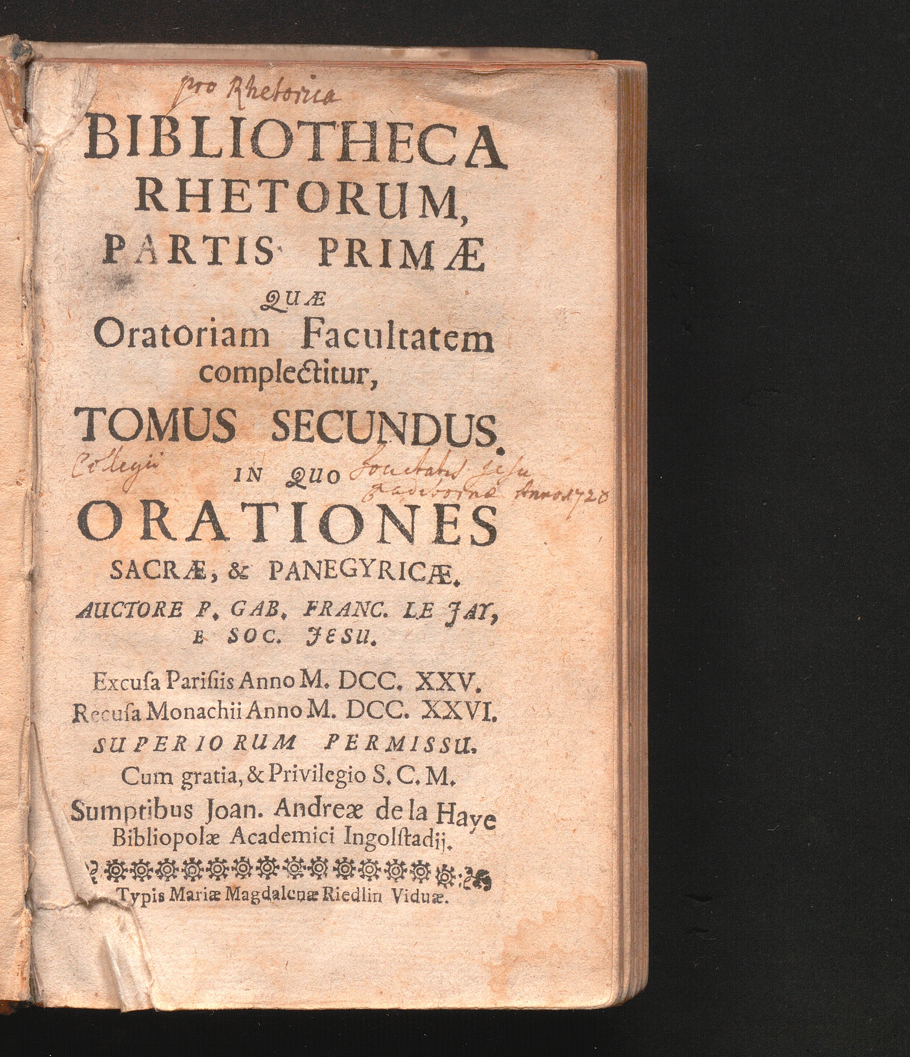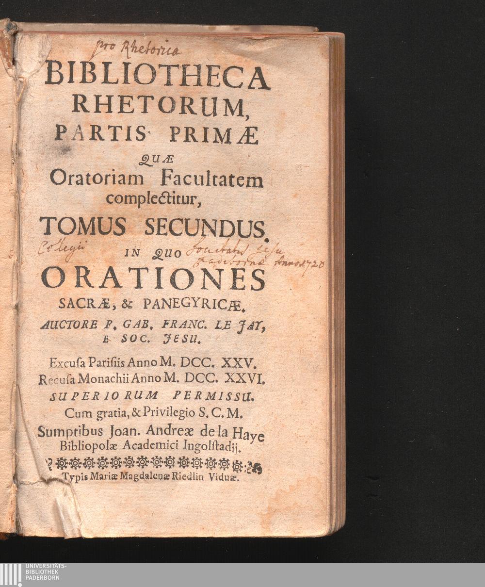 Partis Primae Quae Oratoriam Facultatem complectitur, Tomus Secundus (1726) In Quo Orationes Sacrae, & Panegyricae