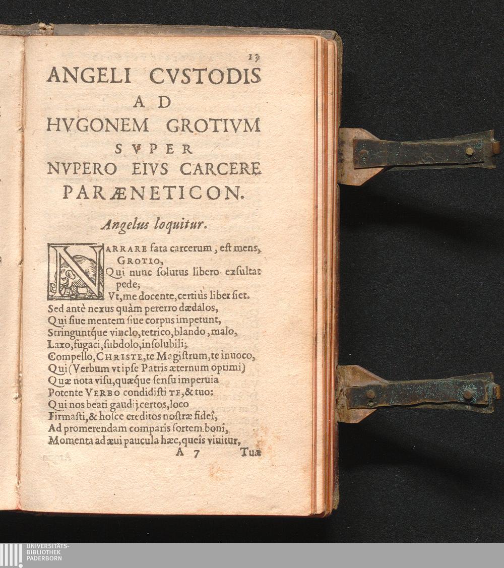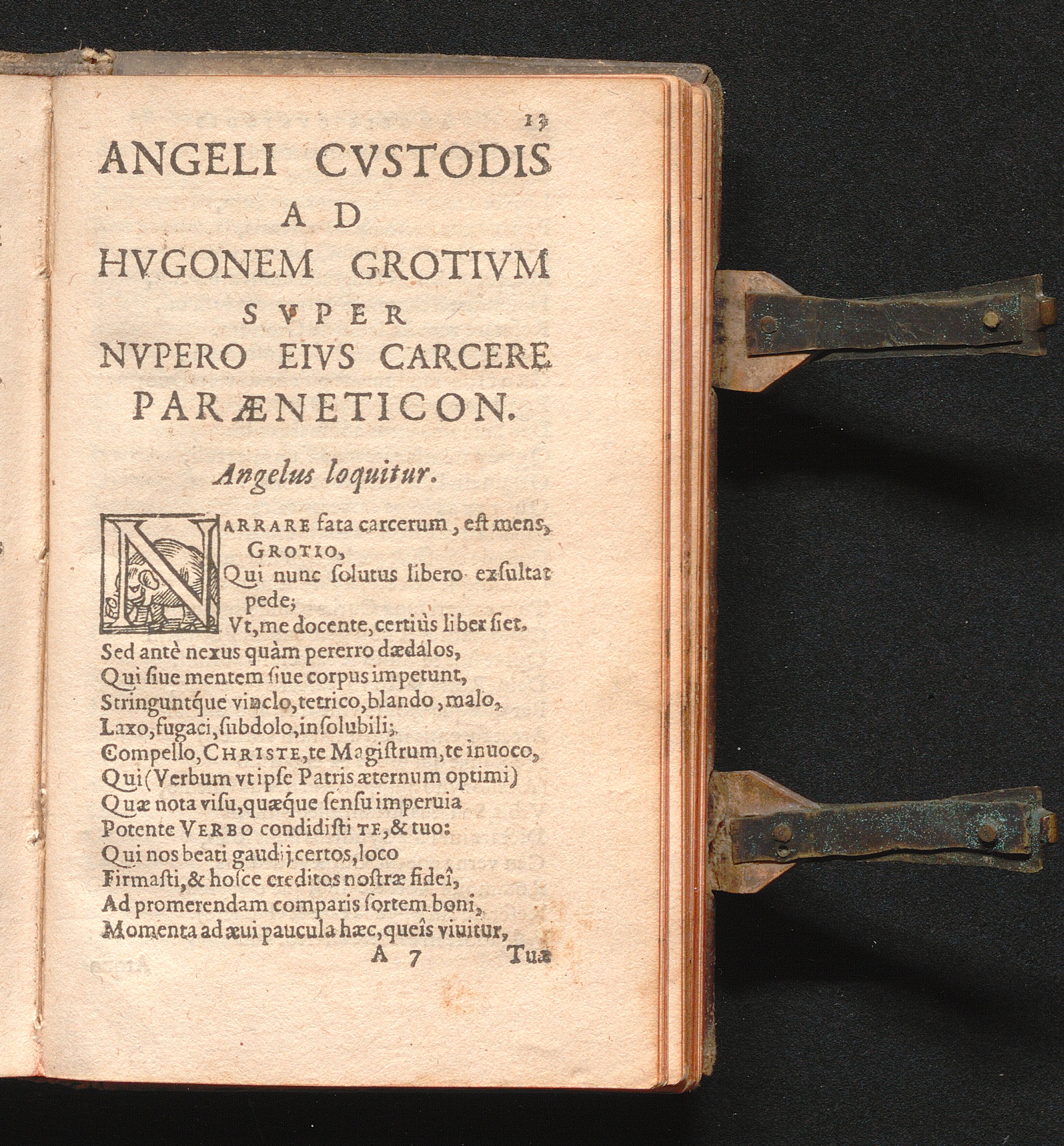 Angeli Cvstodis Ad Hvgonem Grotivm Svper Nvpero Eivs Carcere Paræneticon. Angelus loquitur.
