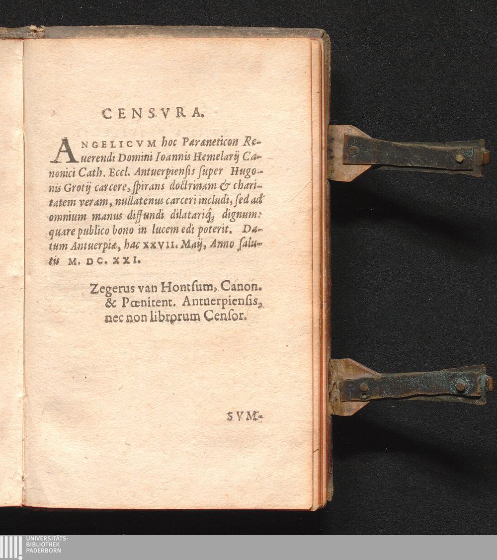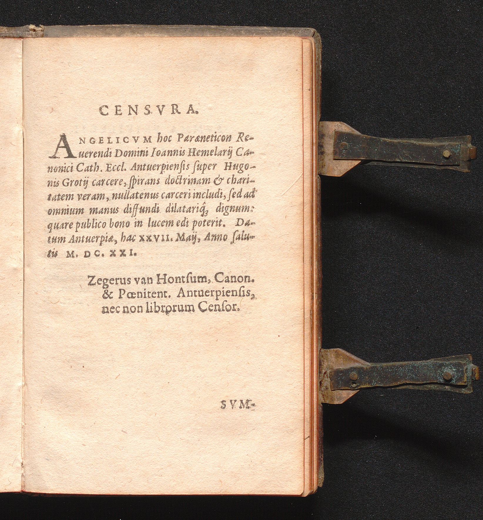 Angeli Cvstodis Ad Hvgonem Grotivm Svper Nvpero Eivs Carcere Paræneticon / exceptum & publicatum à Ioanne Hemelario Hagiensi Canonico Cath. Eccles. Antuerp.