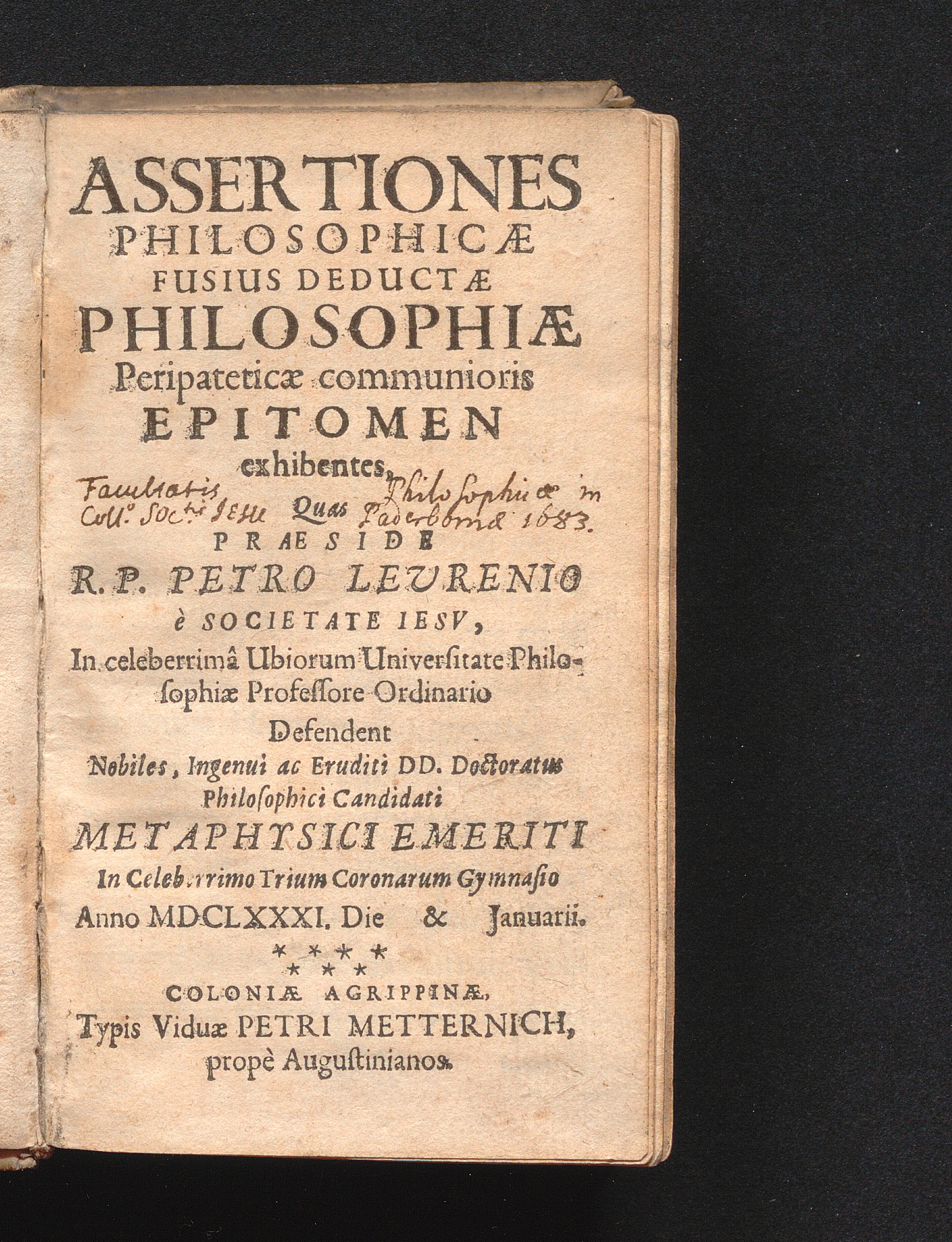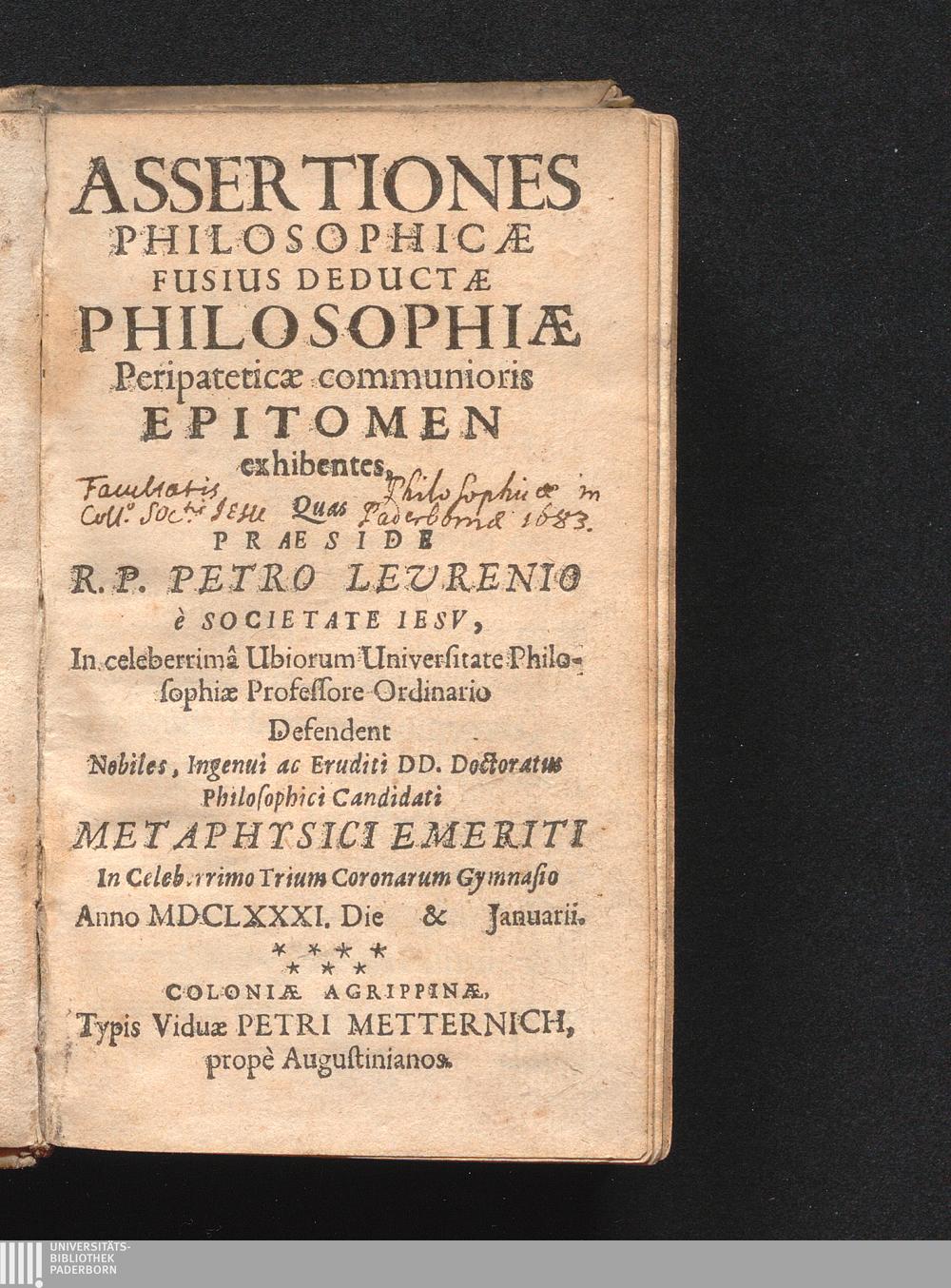 Assertiones Philosophicæ Fusius Deductæ Philosophiæ Peripateticæ communioris Epitomen exhibentes : Anno MDCLXXXI. Die [...] & [...] Januarii / Quas Præside R. P. Petro Levrenio è Societate Iesv ... Defendent Nobiles, Ingenui ac Eruditi DD. Doctoratus Philosophici Candidati Metaphysici Emeriti In Celeberrimo Trium Coronarum Gymnasio