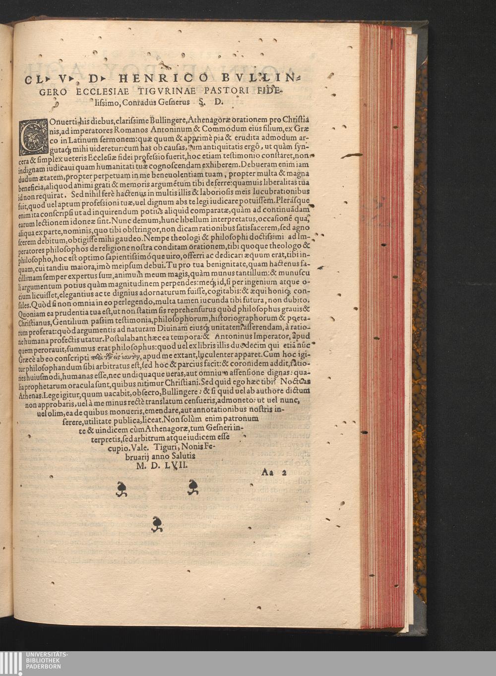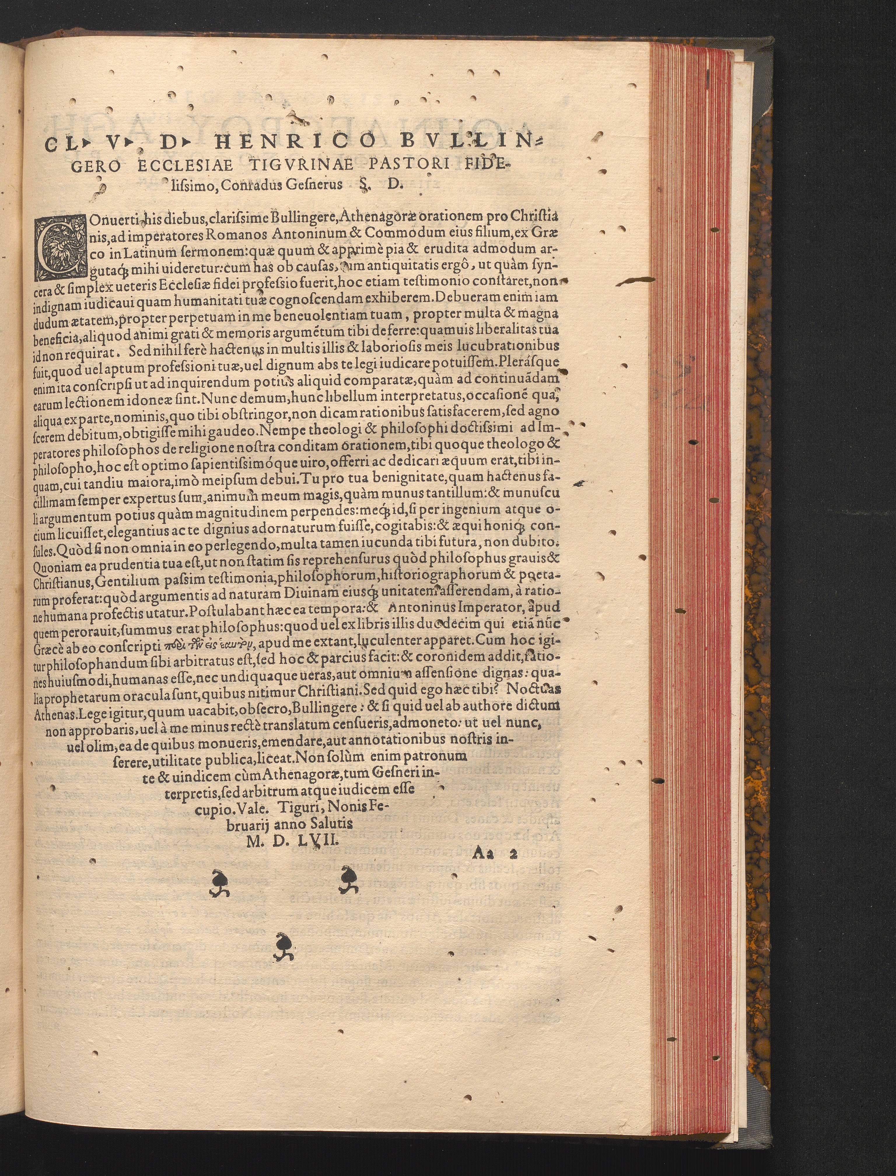 CL. V. D. Henrico Bvllingero Ecclesiae TigvrinaePastori Fidelissimo, Conradus Gesnerus[...]