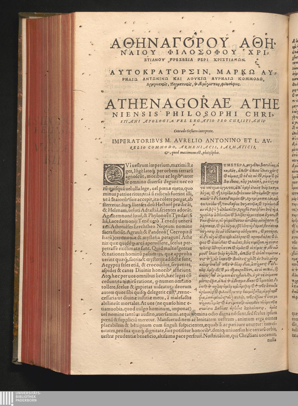 Athenagorae Atheniensis Philosophi Christiani Apologia Pro Christianis, ad imperatores[...]