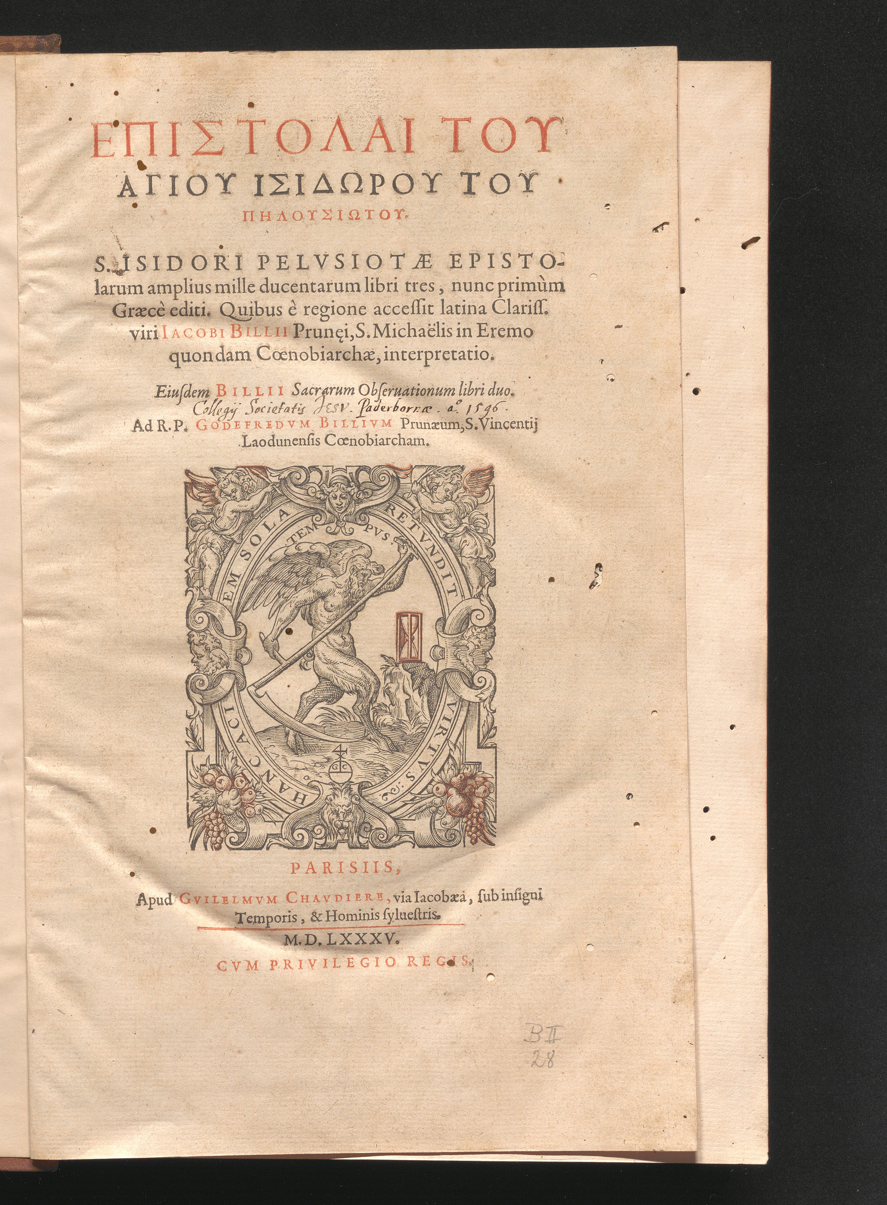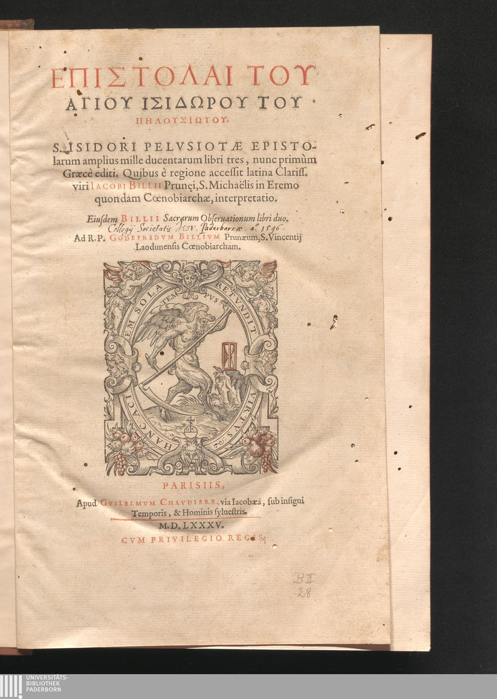 Epistolai tu hagiu Isidōru tu Pēlusiōtu / Quibus è regione accessit latina Clariss. viri Iacobi Billii Prunęi, S. Michaëlis in Eremo quondam Cœnobiarchæ, interpretatio