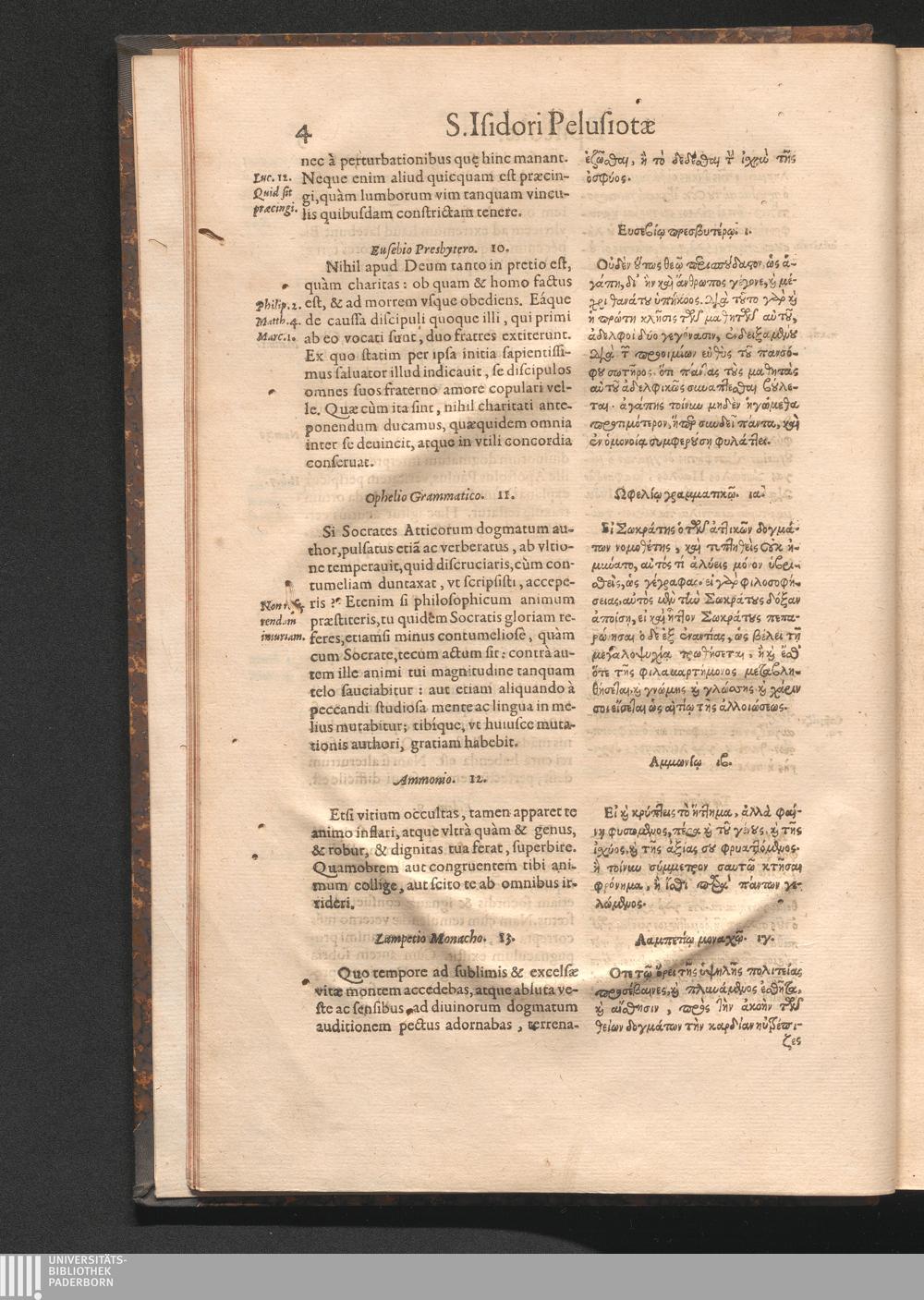 Epistolai tu hagiu Isidōru tu Pēlusiōtu / Quibus è regione accessit latina Clariss. viri Iacobi Billii Prunęi, S. Michaëlis in Eremo quondam Cœnobiarchæ, interpretatio