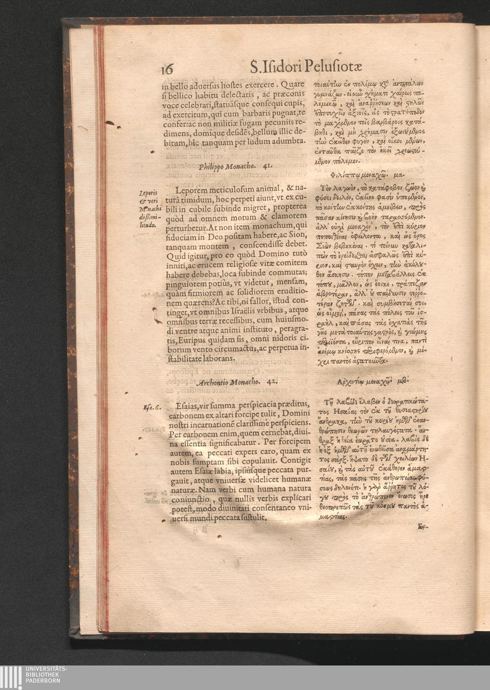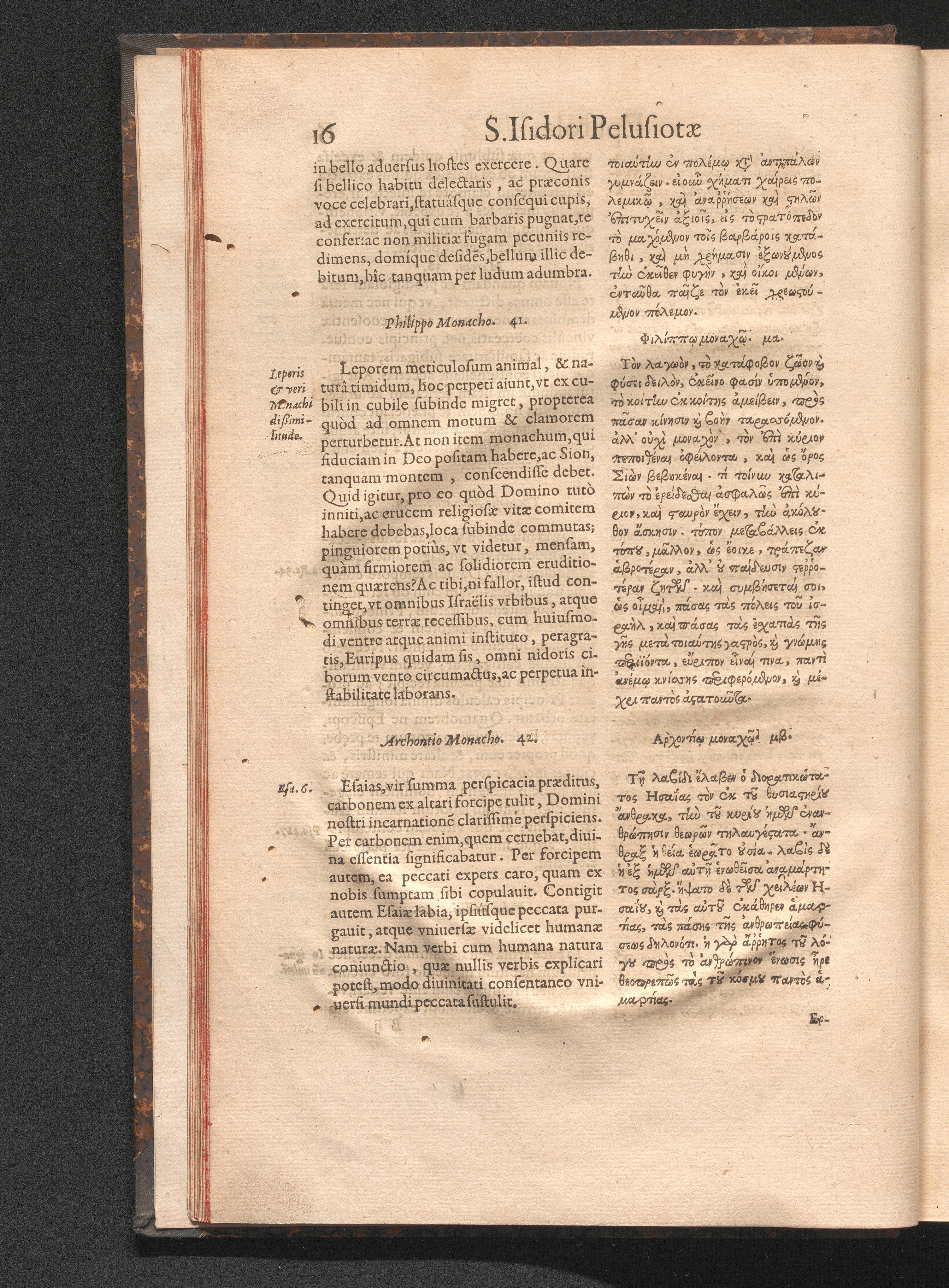 Epistolai tu hagiu Isidōru tu Pēlusiōtu / Quibus è regione accessit latina Clariss. viri Iacobi Billii Prunęi, S. Michaëlis in Eremo quondam Cœnobiarchæ, interpretatio