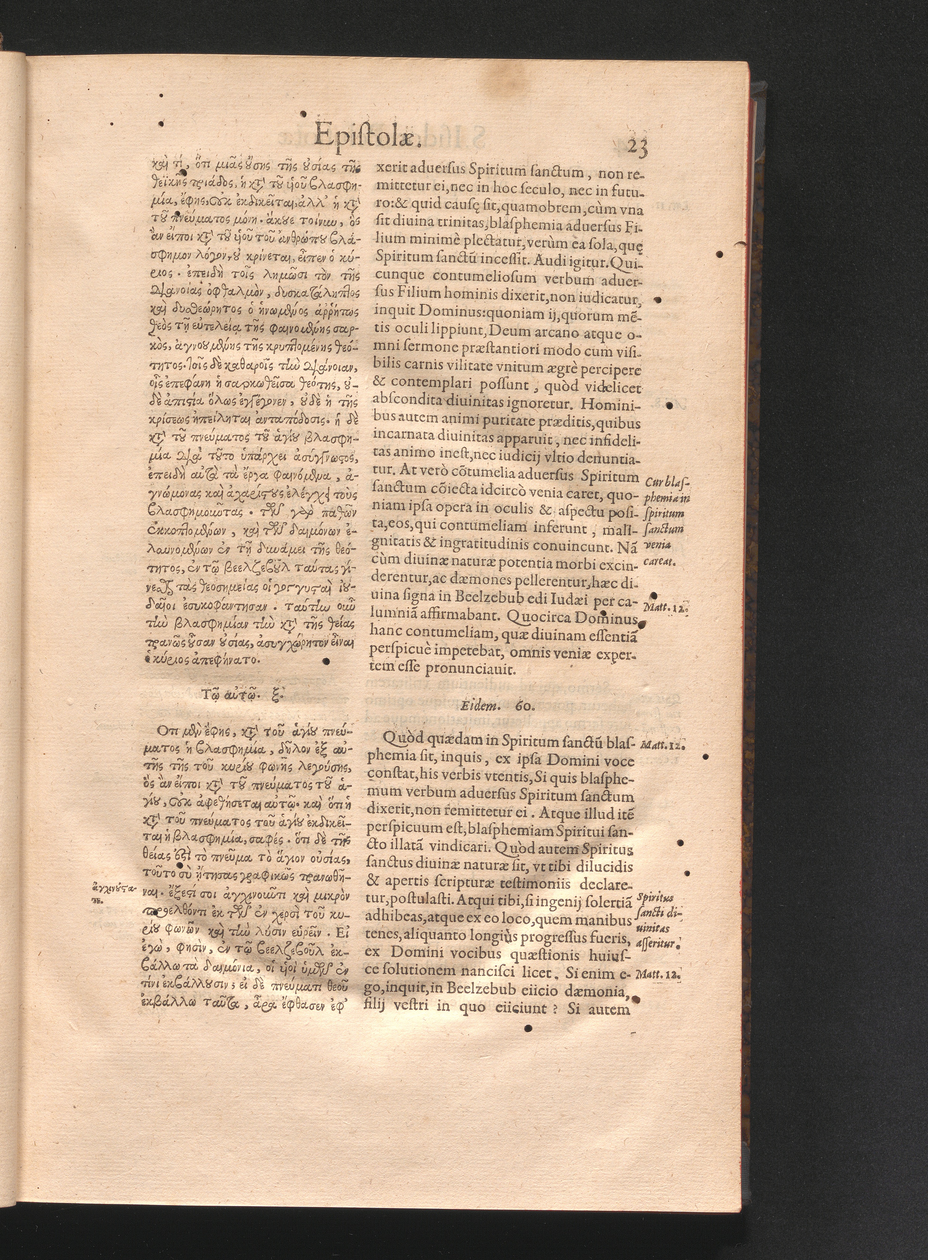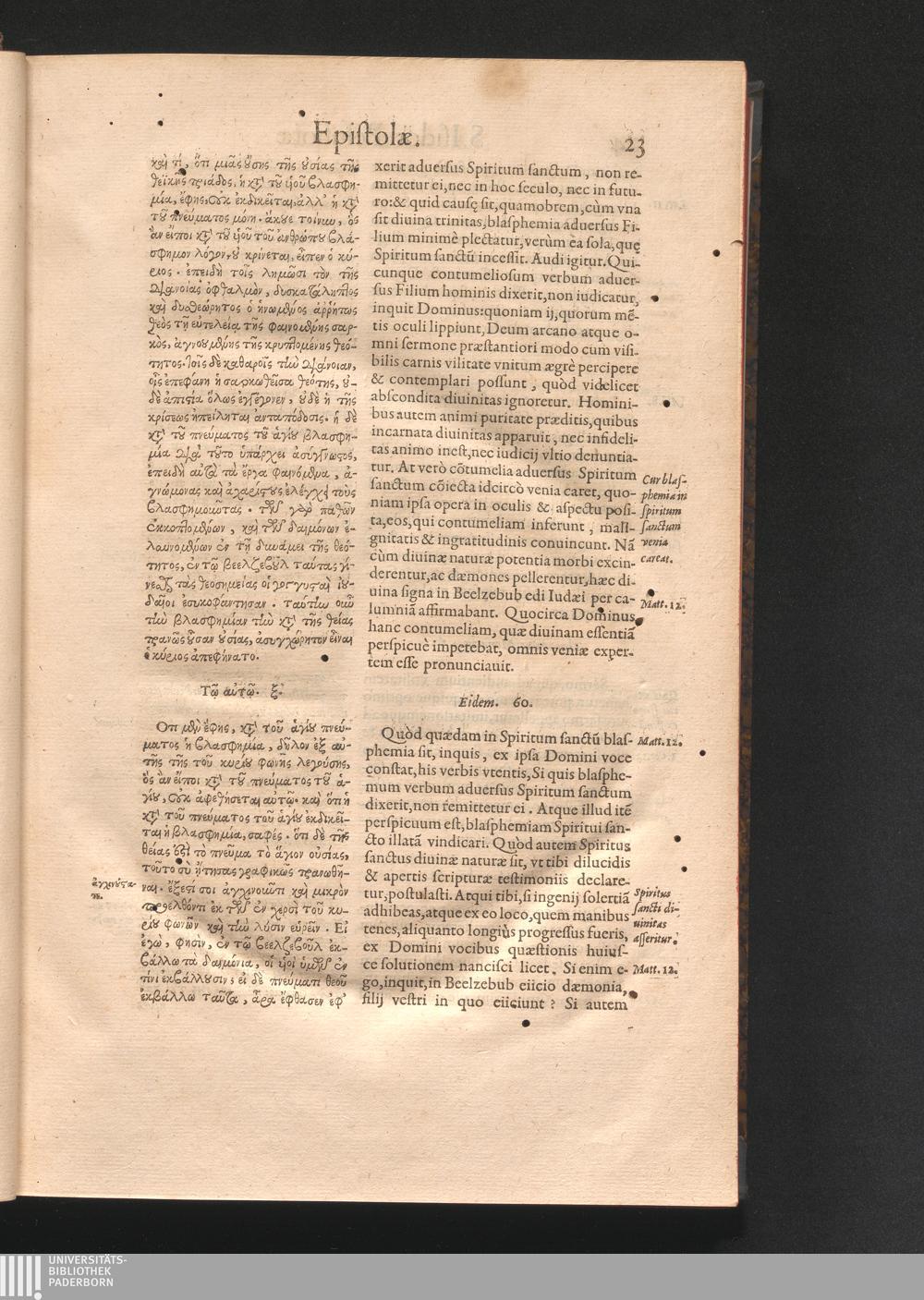 Epistolai tu hagiu Isidōru tu Pēlusiōtu / Quibus è regione accessit latina Clariss. viri Iacobi Billii Prunęi, S. Michaëlis in Eremo quondam Cœnobiarchæ, interpretatio