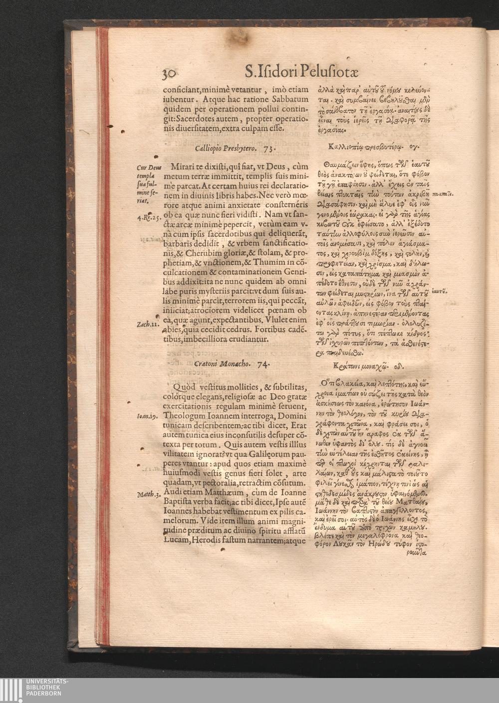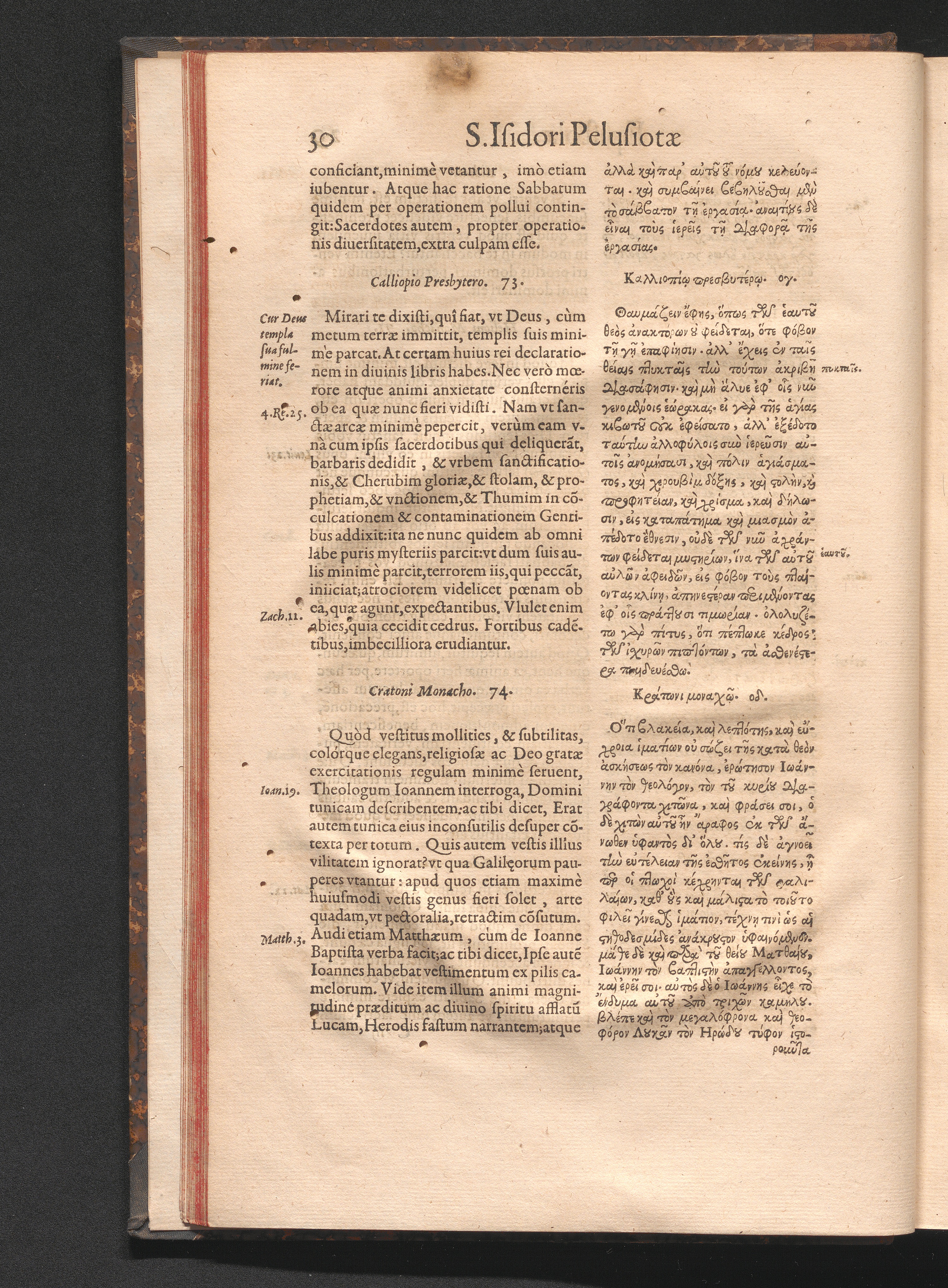 Epistolai tu hagiu Isidōru tu Pēlusiōtu / Quibus è regione accessit latina Clariss. viri Iacobi Billii Prunęi, S. Michaëlis in Eremo quondam Cœnobiarchæ, interpretatio