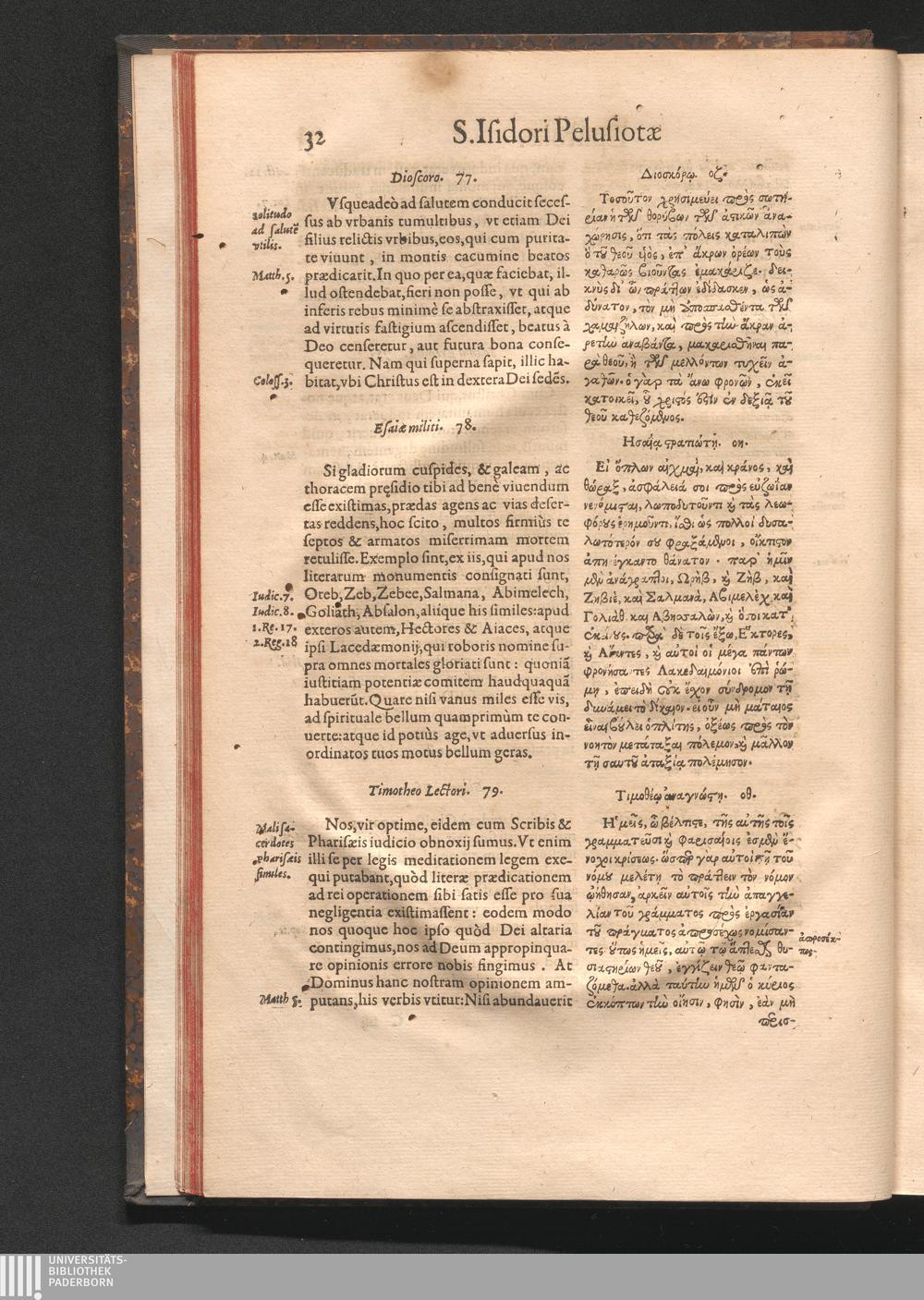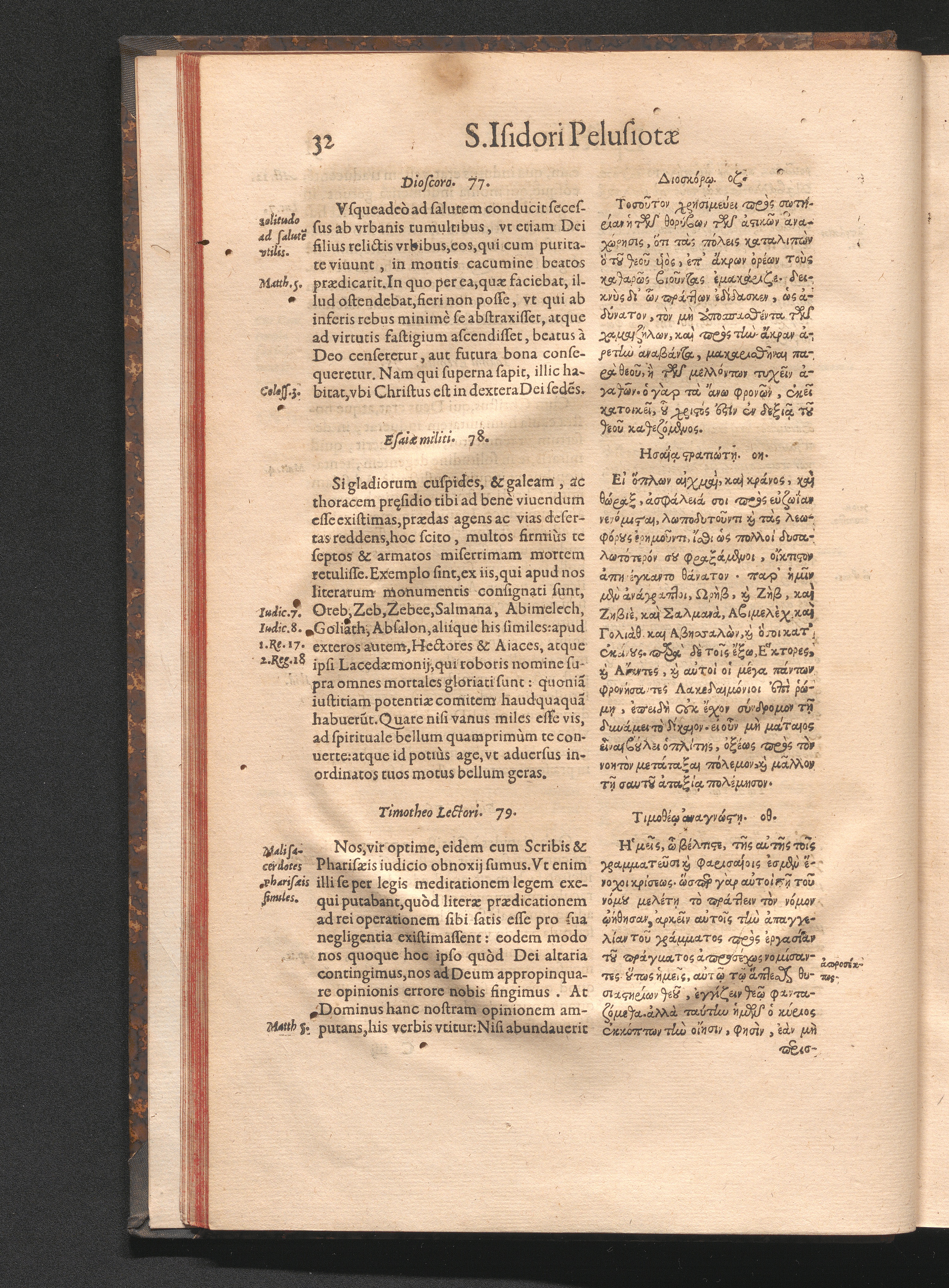 Epistolai tu hagiu Isidōru tu Pēlusiōtu / Quibus è regione accessit latina Clariss. viri Iacobi Billii Prunęi, S. Michaëlis in Eremo quondam Cœnobiarchæ, interpretatio