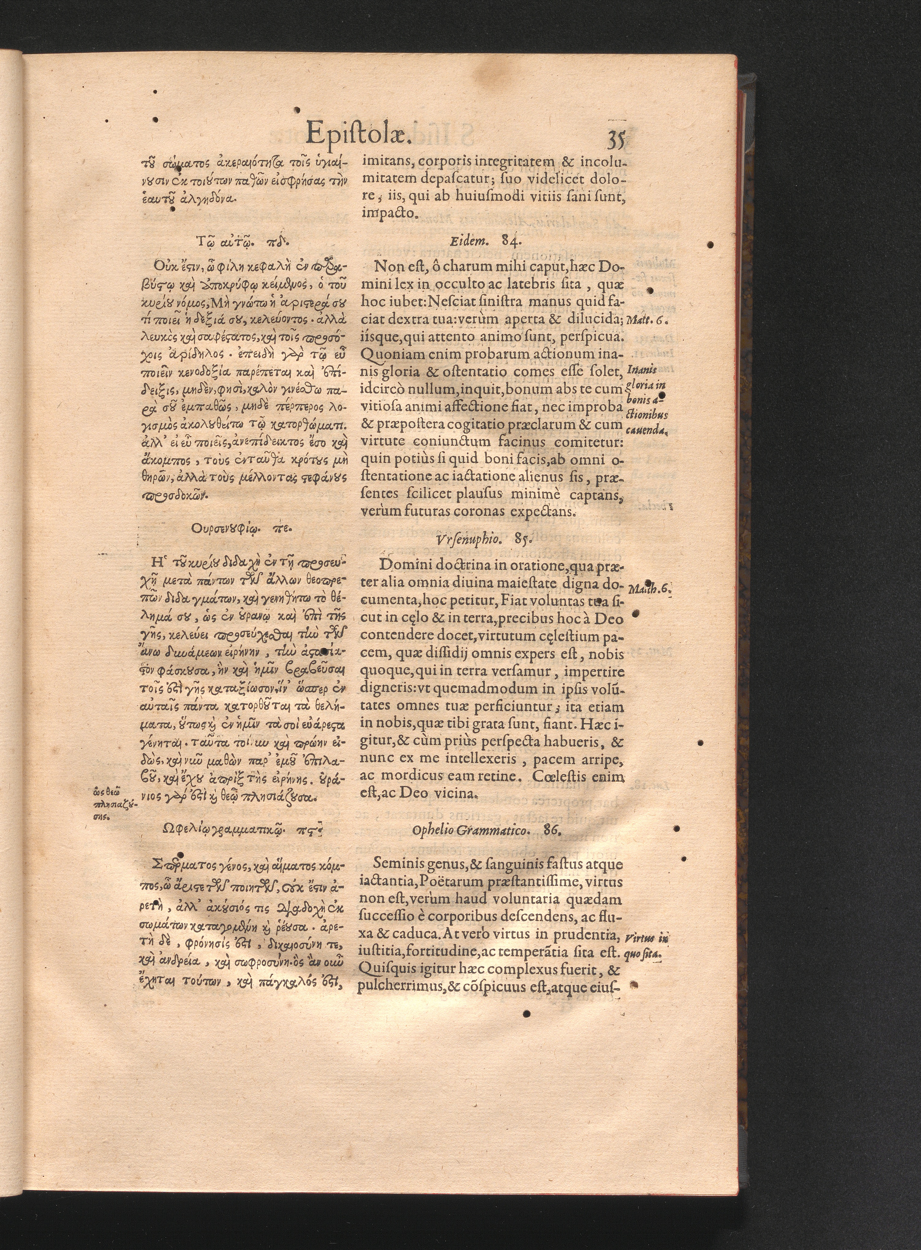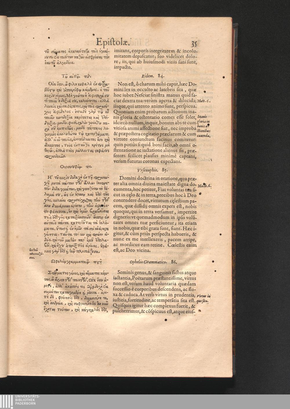 Epistolai tu hagiu Isidōru tu Pēlusiōtu / Quibus è regione accessit latina Clariss. viri Iacobi Billii Prunęi, S. Michaëlis in Eremo quondam Cœnobiarchæ, interpretatio