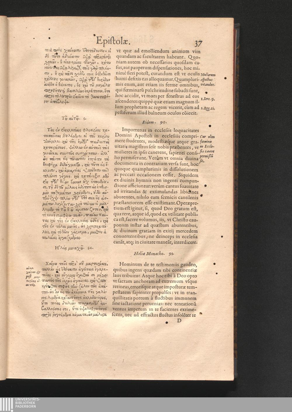Epistolai tu hagiu Isidōru tu Pēlusiōtu / Quibus è regione accessit latina Clariss. viri Iacobi Billii Prunęi, S. Michaëlis in Eremo quondam Cœnobiarchæ, interpretatio
