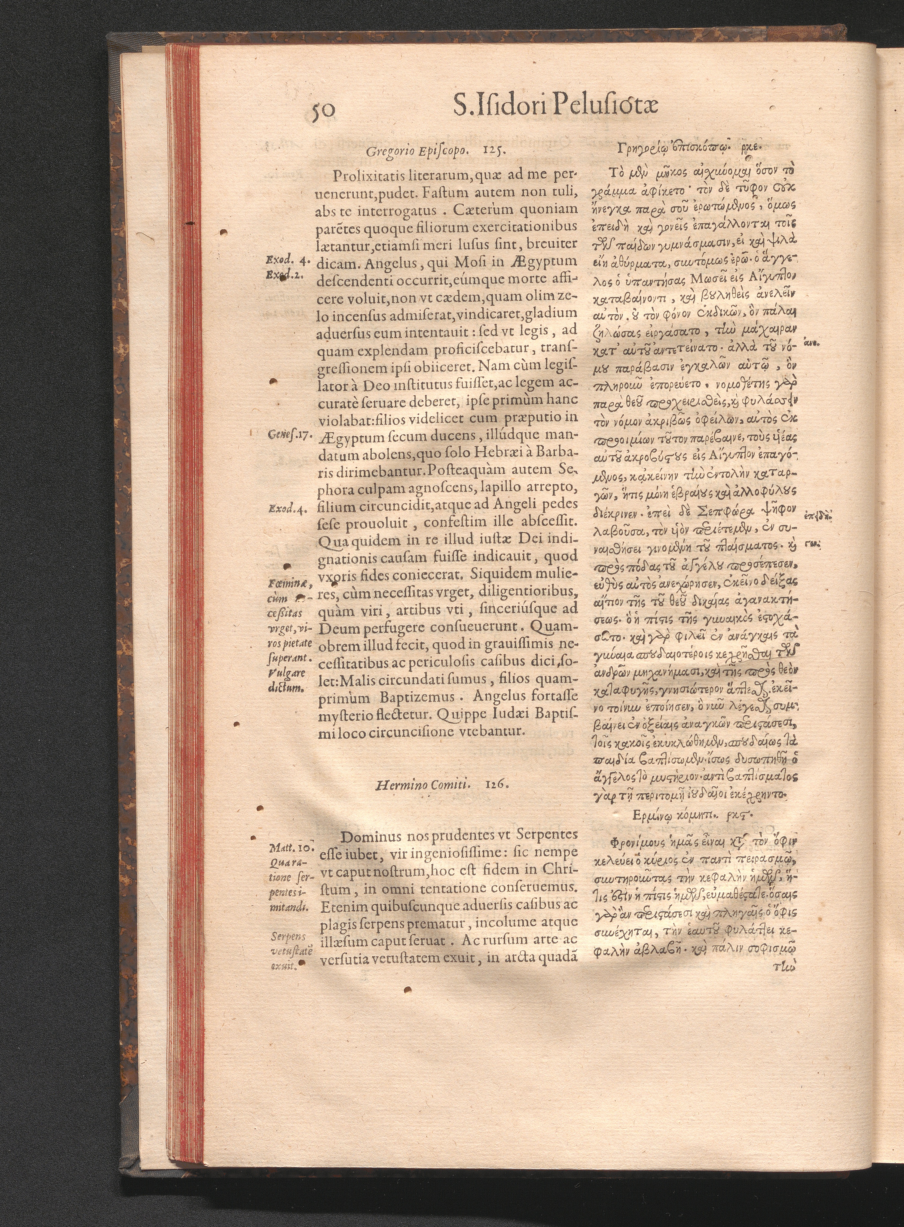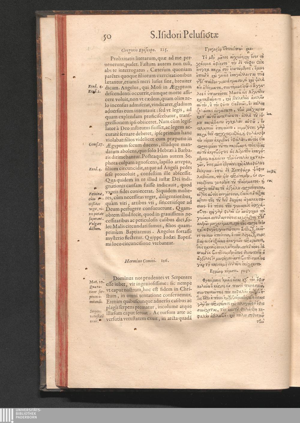 Epistolai tu hagiu Isidōru tu Pēlusiōtu / Quibus è regione accessit latina Clariss. viri Iacobi Billii Prunęi, S. Michaëlis in Eremo quondam Cœnobiarchæ, interpretatio