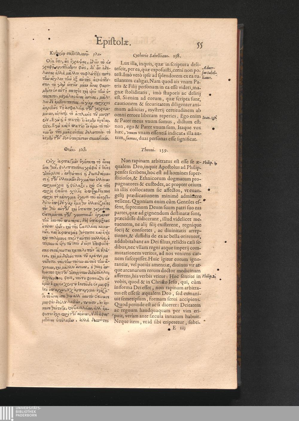 Epistolai tu hagiu Isidōru tu Pēlusiōtu / Quibus è regione accessit latina Clariss. viri Iacobi Billii Prunęi, S. Michaëlis in Eremo quondam Cœnobiarchæ, interpretatio