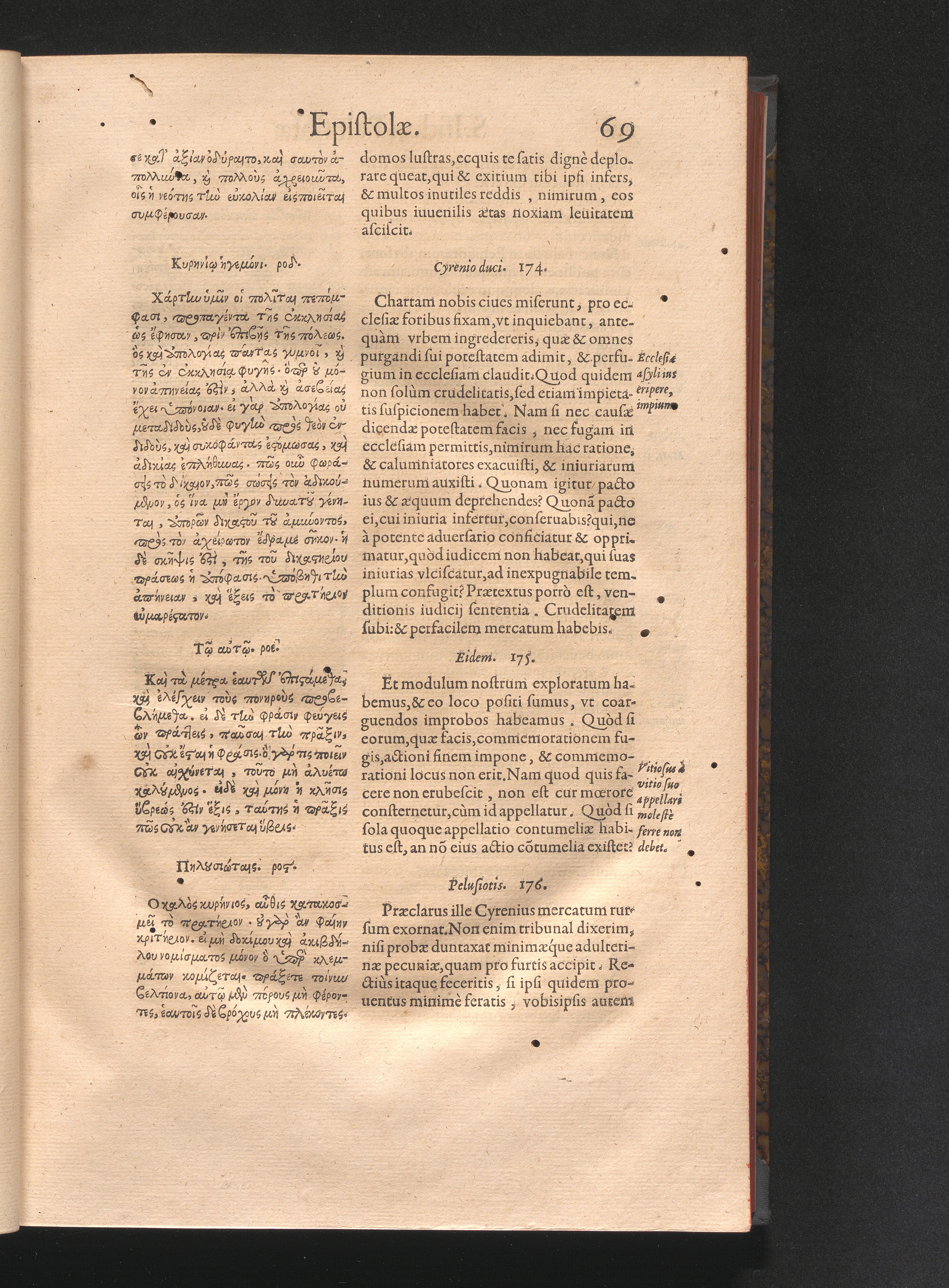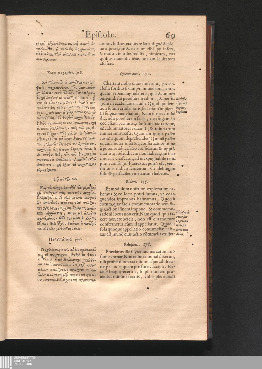 Epistolai tu hagiu Isidōru tu Pēlusiōtu / Quibus è regione accessit latina Clariss. viri Iacobi Billii Prunęi, S. Michaëlis in Eremo quondam Cœnobiarchæ, interpretatio