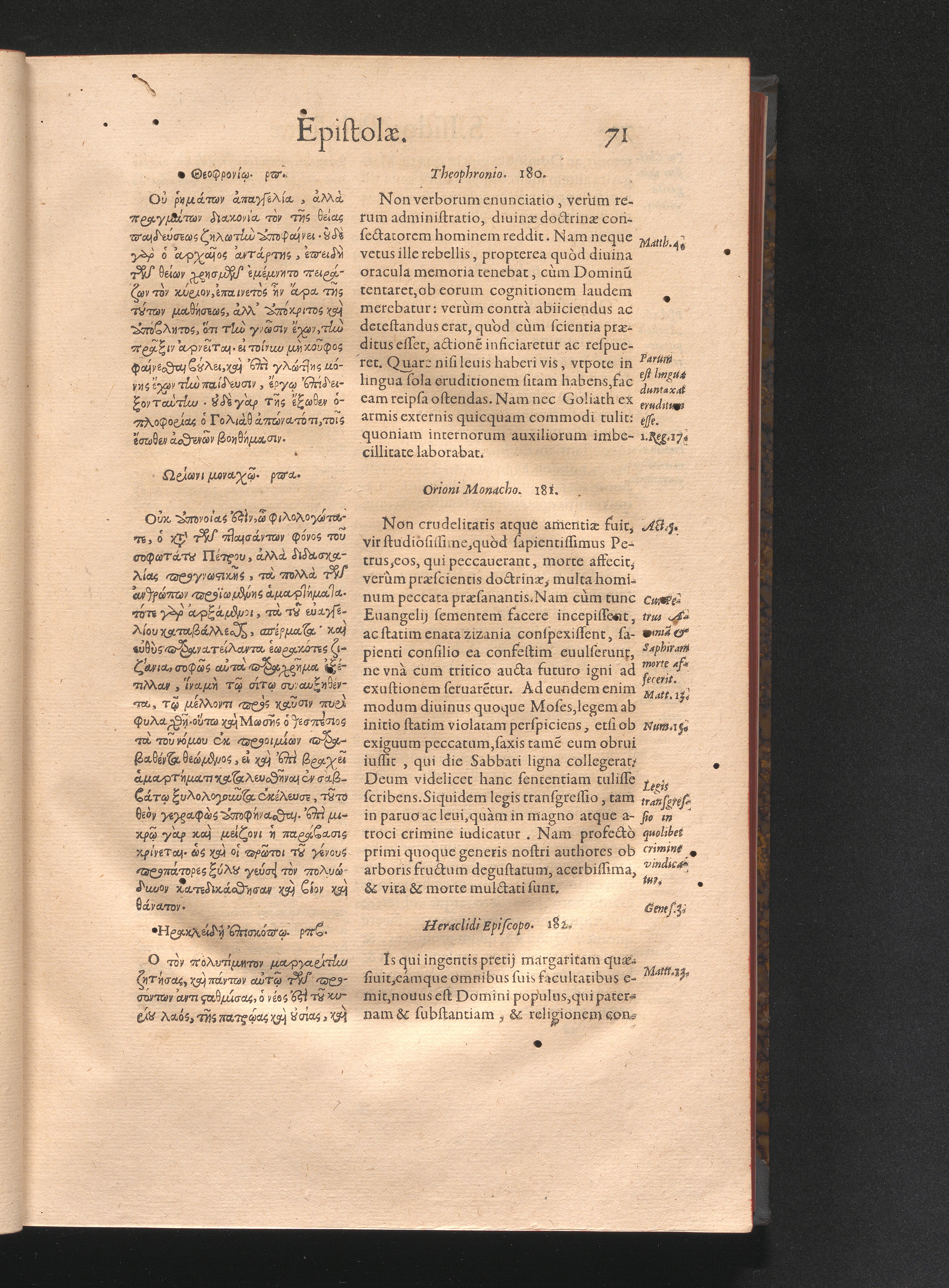 Epistolai tu hagiu Isidōru tu Pēlusiōtu / Quibus è regione accessit latina Clariss. viri Iacobi Billii Prunęi, S. Michaëlis in Eremo quondam Cœnobiarchæ, interpretatio