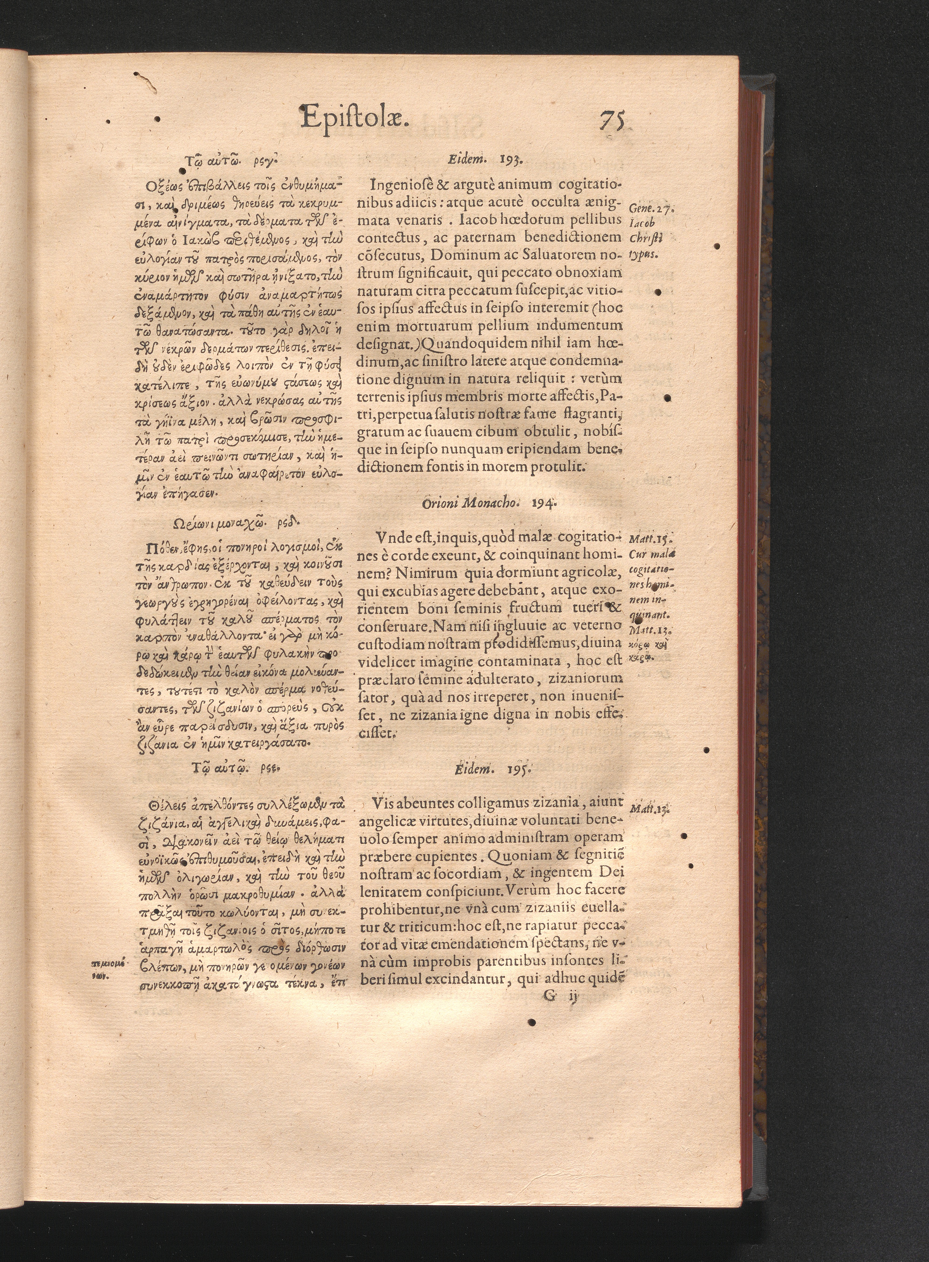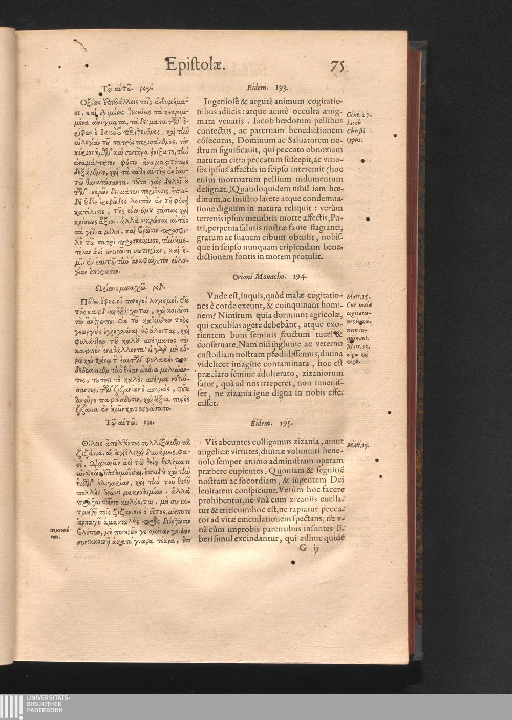 Epistolai tu hagiu Isidōru tu Pēlusiōtu / Quibus è regione accessit latina Clariss. viri Iacobi Billii Prunęi, S. Michaëlis in Eremo quondam Cœnobiarchæ, interpretatio