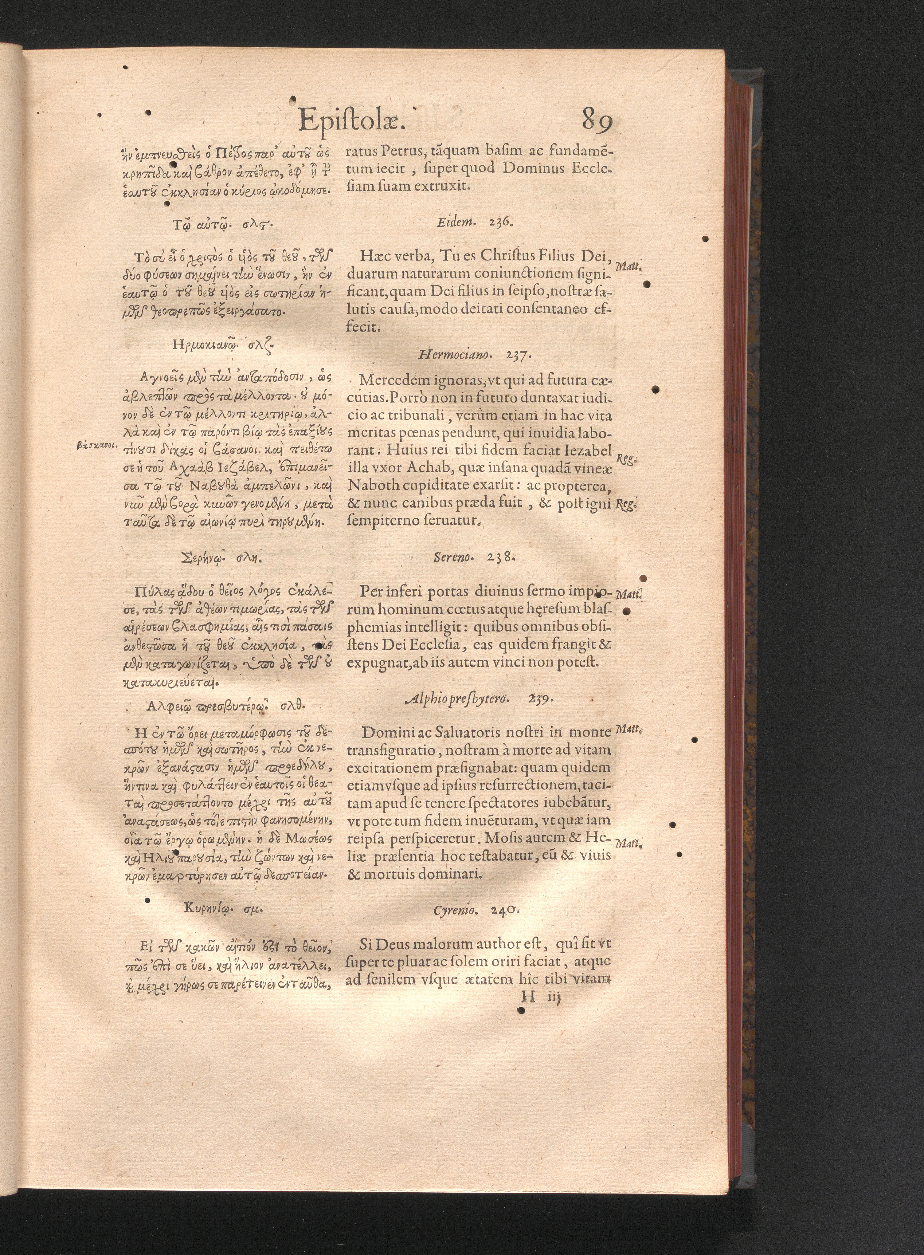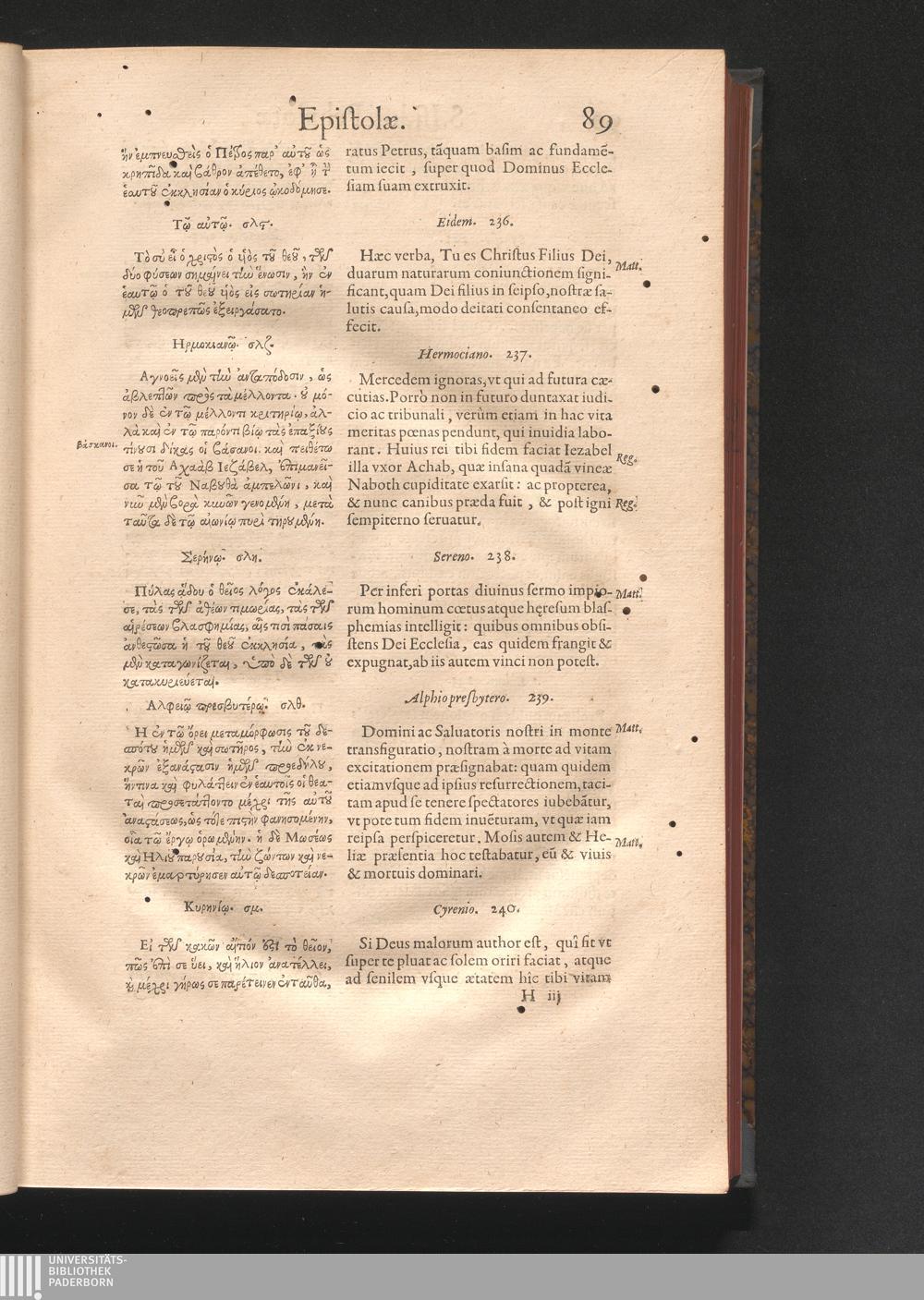 Epistolai tu hagiu Isidōru tu Pēlusiōtu / Quibus è regione accessit latina Clariss. viri Iacobi Billii Prunęi, S. Michaëlis in Eremo quondam Cœnobiarchæ, interpretatio