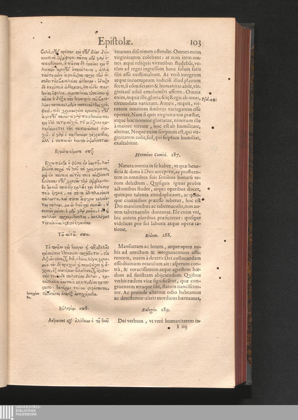 Epistolai tu hagiu Isidōru tu Pēlusiōtu / Quibus è regione accessit latina Clariss. viri Iacobi Billii Prunęi, S. Michaëlis in Eremo quondam Cœnobiarchæ, interpretatio