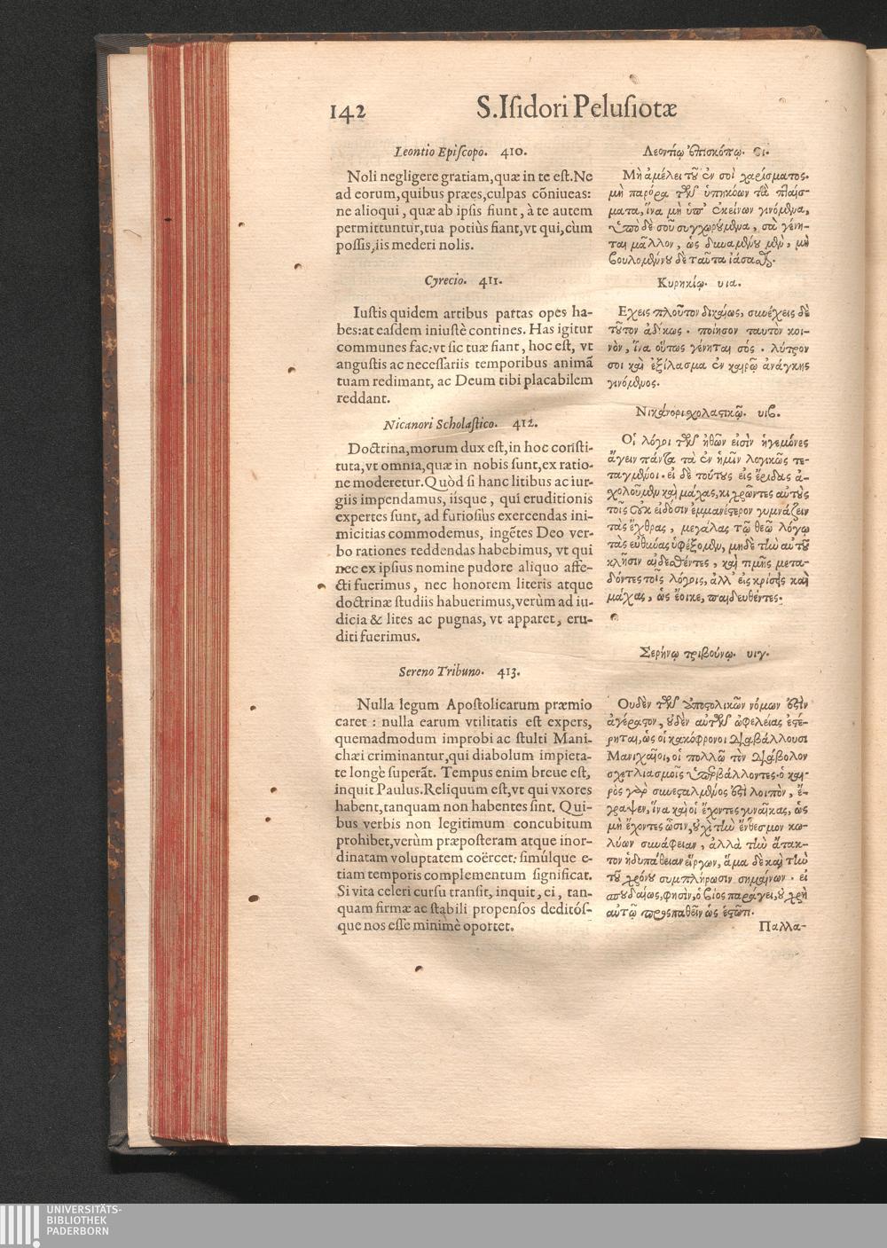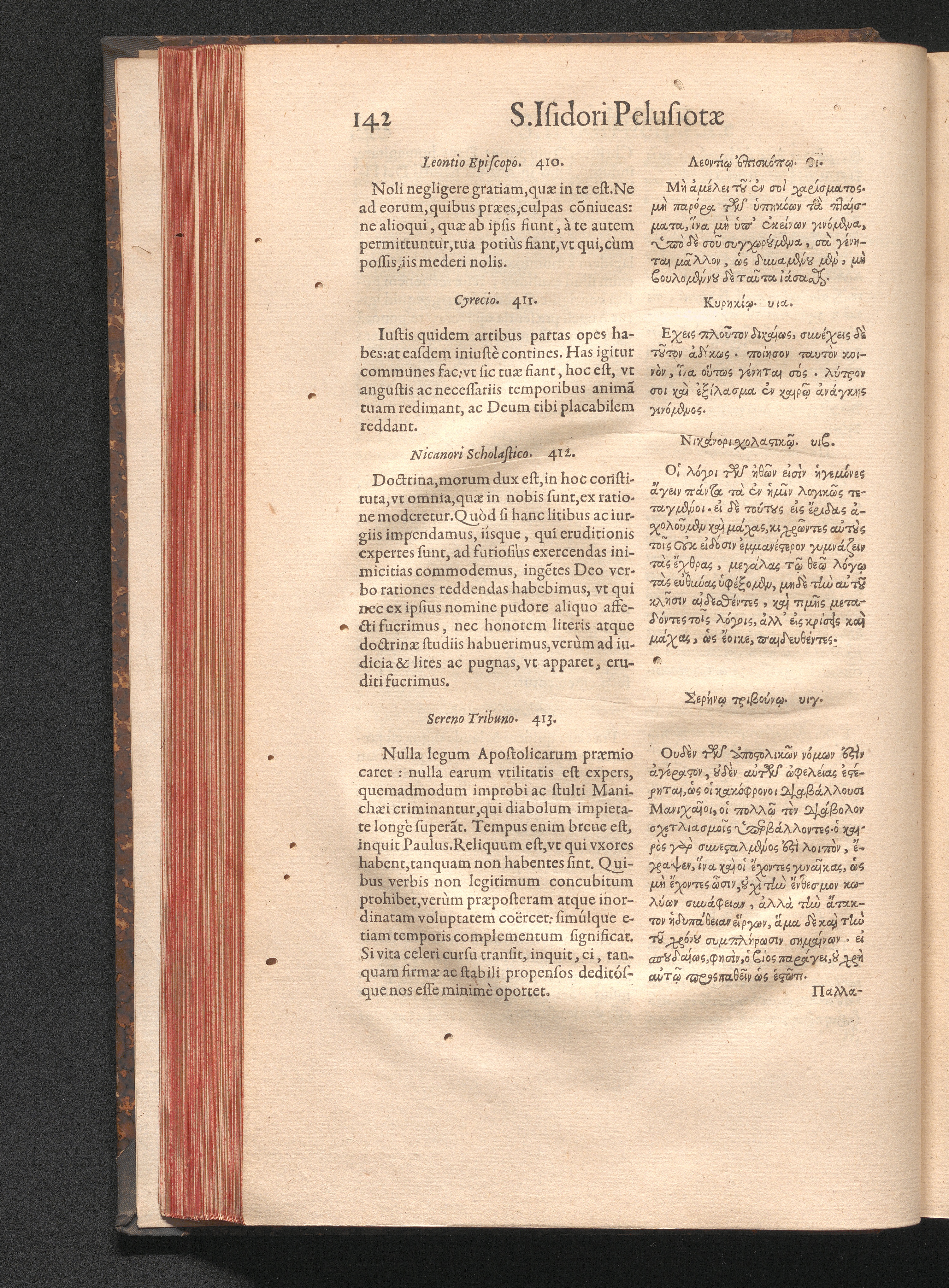 Epistolai tu hagiu Isidōru tu Pēlusiōtu / Quibus è regione accessit latina Clariss. viri Iacobi Billii Prunęi, S. Michaëlis in Eremo quondam Cœnobiarchæ, interpretatio