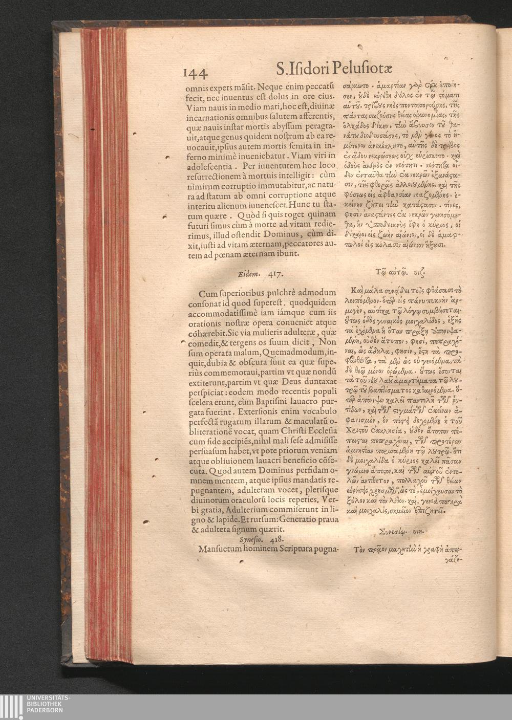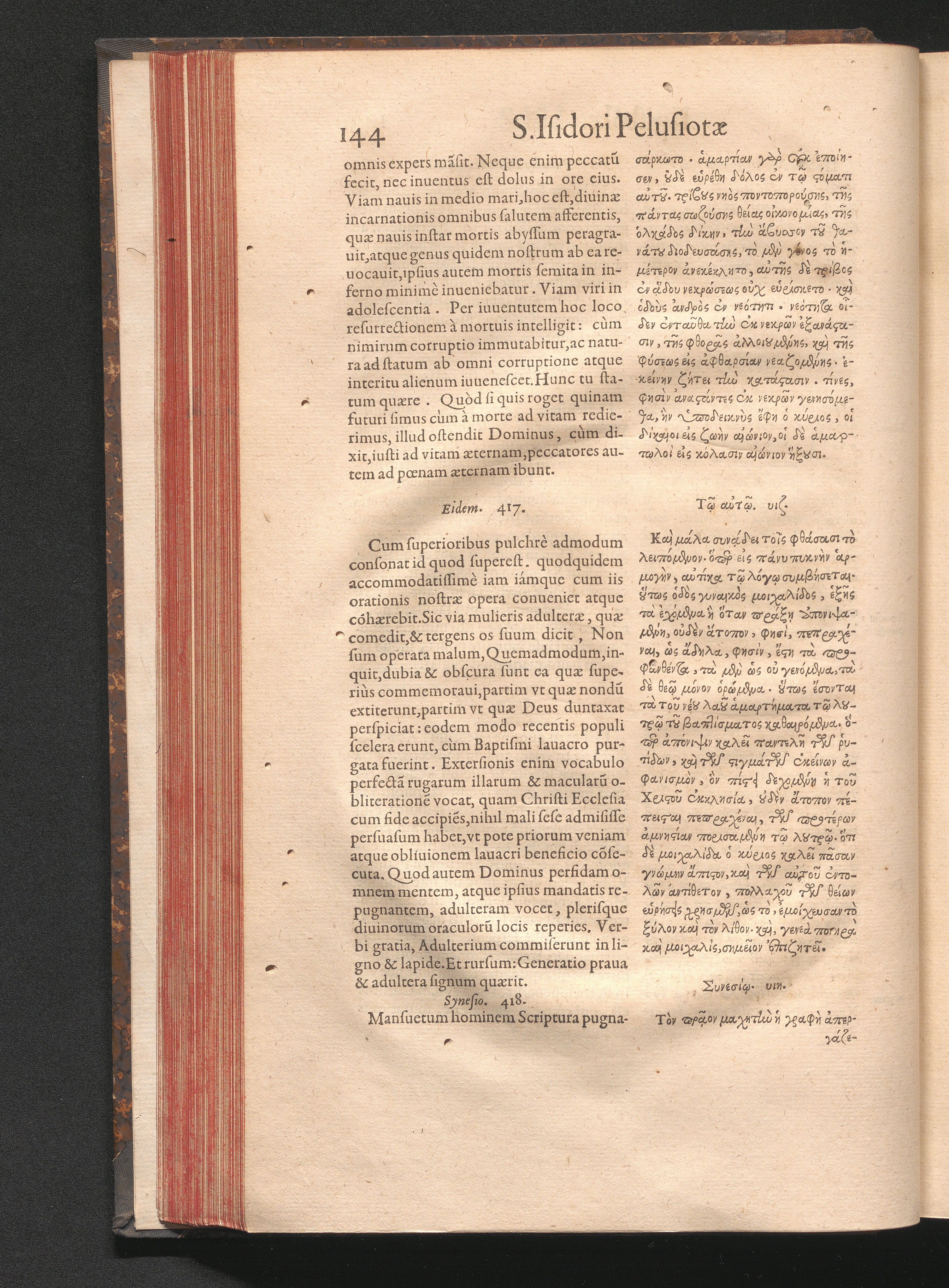 Epistolai tu hagiu Isidōru tu Pēlusiōtu / Quibus è regione accessit latina Clariss. viri Iacobi Billii Prunęi, S. Michaëlis in Eremo quondam Cœnobiarchæ, interpretatio