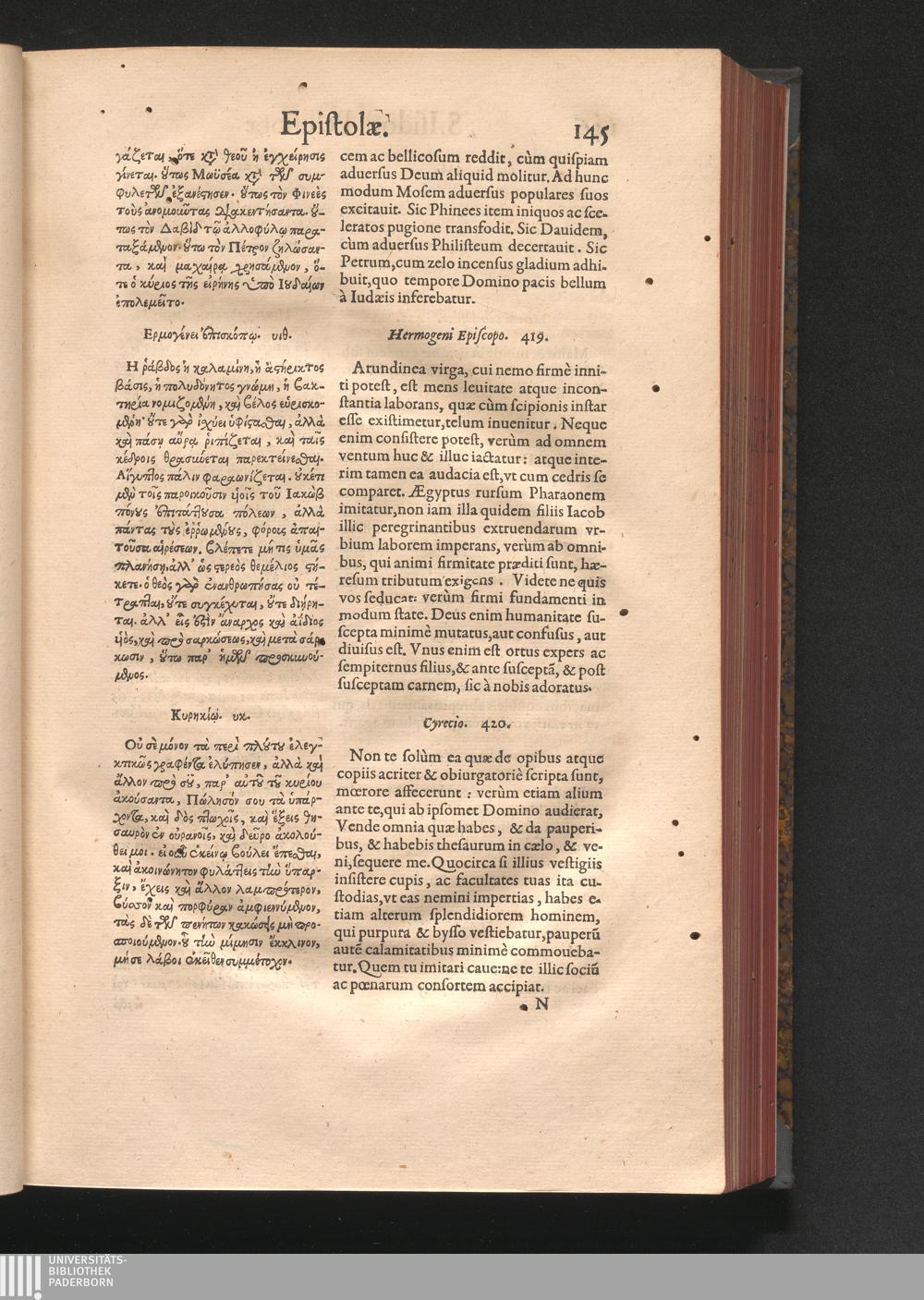 Epistolai tu hagiu Isidōru tu Pēlusiōtu / Quibus è regione accessit latina Clariss. viri Iacobi Billii Prunęi, S. Michaëlis in Eremo quondam Cœnobiarchæ, interpretatio