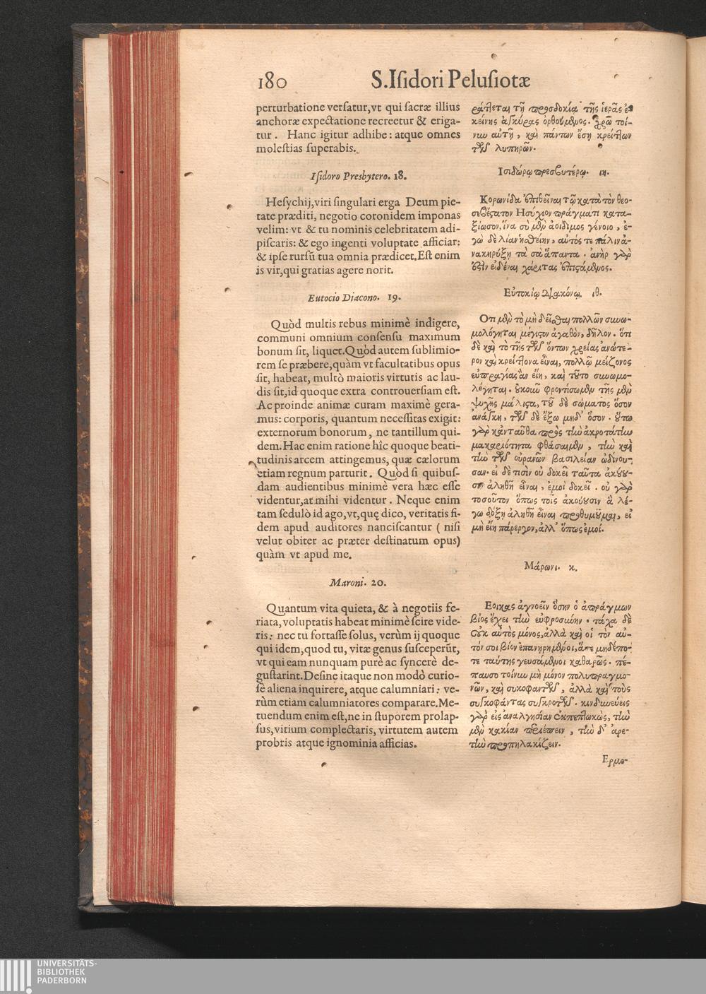 Epistolai tu hagiu Isidōru tu Pēlusiōtu / Quibus è regione accessit latina Clariss. viri Iacobi Billii Prunęi, S. Michaëlis in Eremo quondam Cœnobiarchæ, interpretatio
