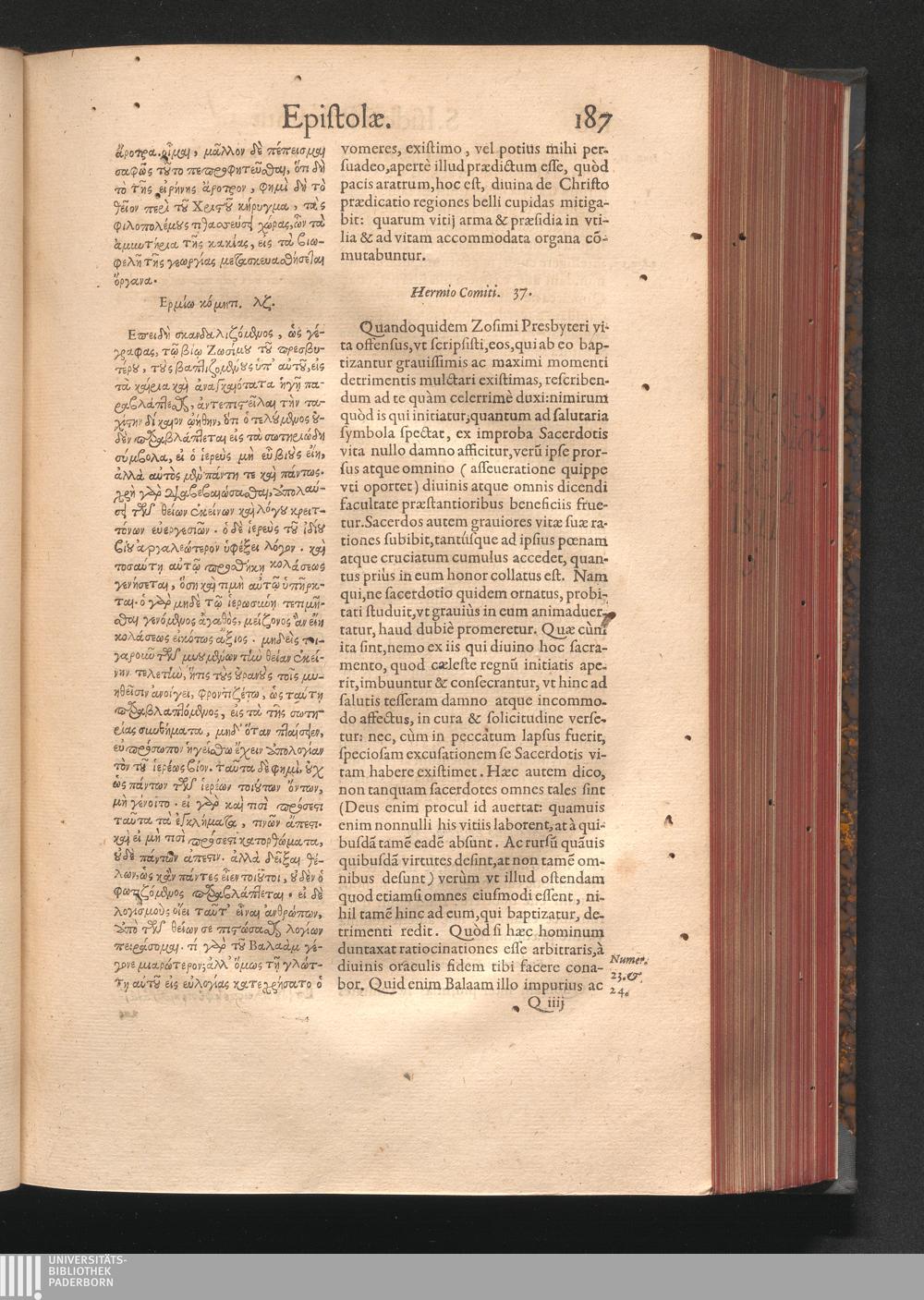 Epistolai tu hagiu Isidōru tu Pēlusiōtu / Quibus è regione accessit latina Clariss. viri Iacobi Billii Prunęi, S. Michaëlis in Eremo quondam Cœnobiarchæ, interpretatio