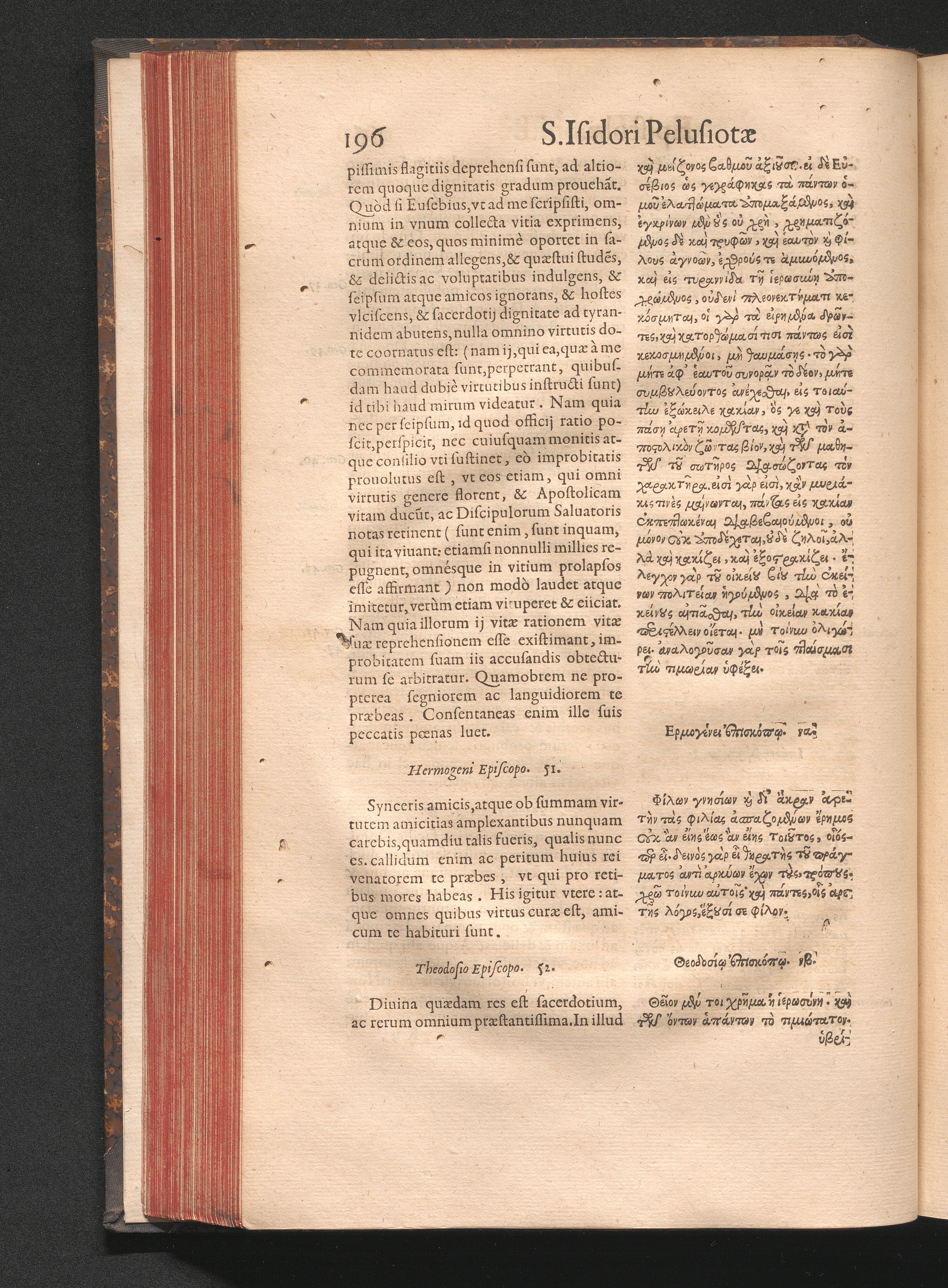 Epistolai tu hagiu Isidōru tu Pēlusiōtu / Quibus è regione accessit latina Clariss. viri Iacobi Billii Prunęi, S. Michaëlis in Eremo quondam Cœnobiarchæ, interpretatio