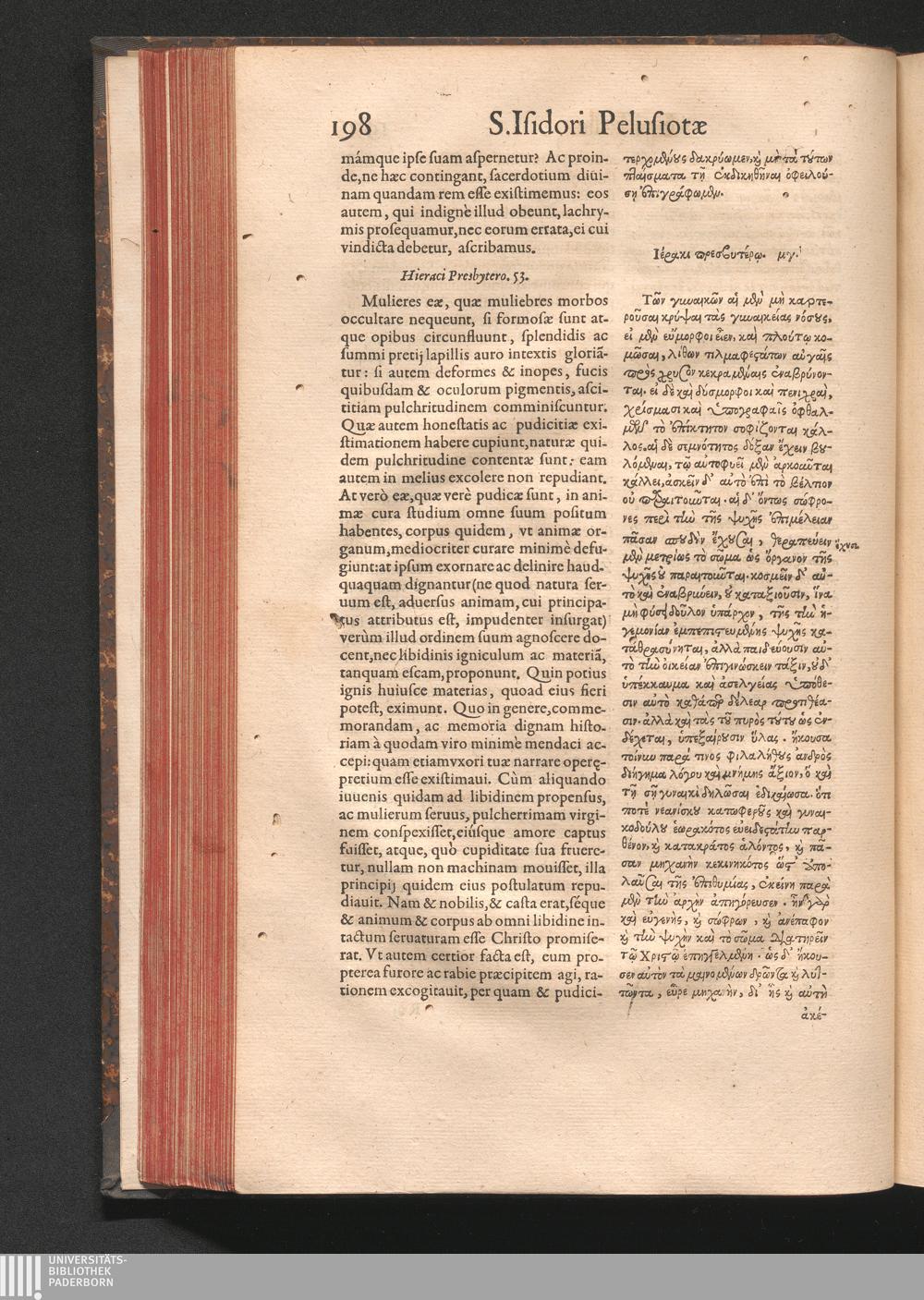 Epistolai tu hagiu Isidōru tu Pēlusiōtu / Quibus è regione accessit latina Clariss. viri Iacobi Billii Prunęi, S. Michaëlis in Eremo quondam Cœnobiarchæ, interpretatio