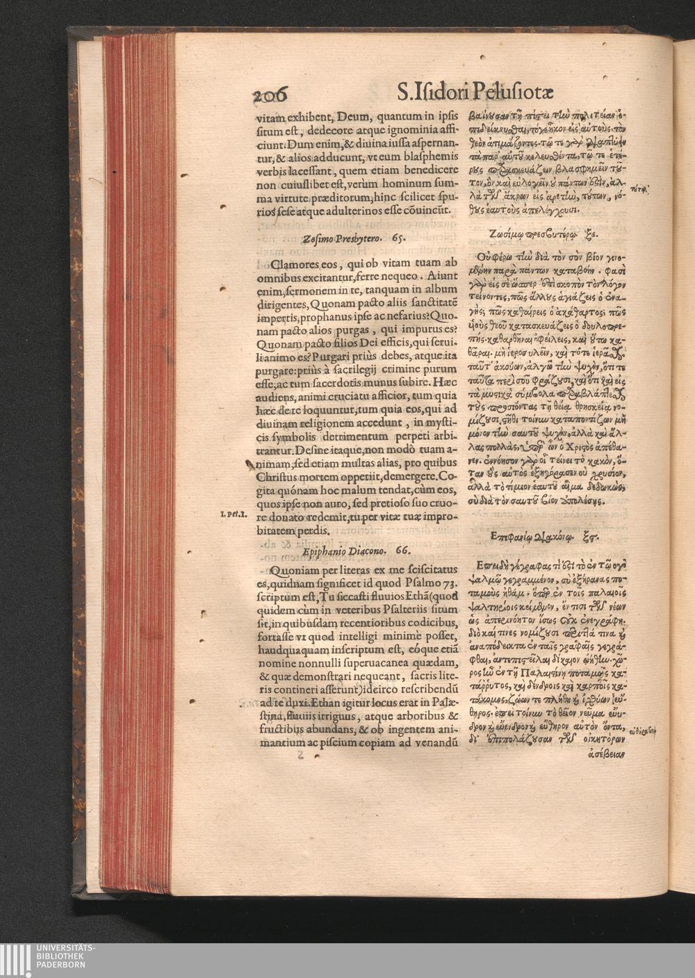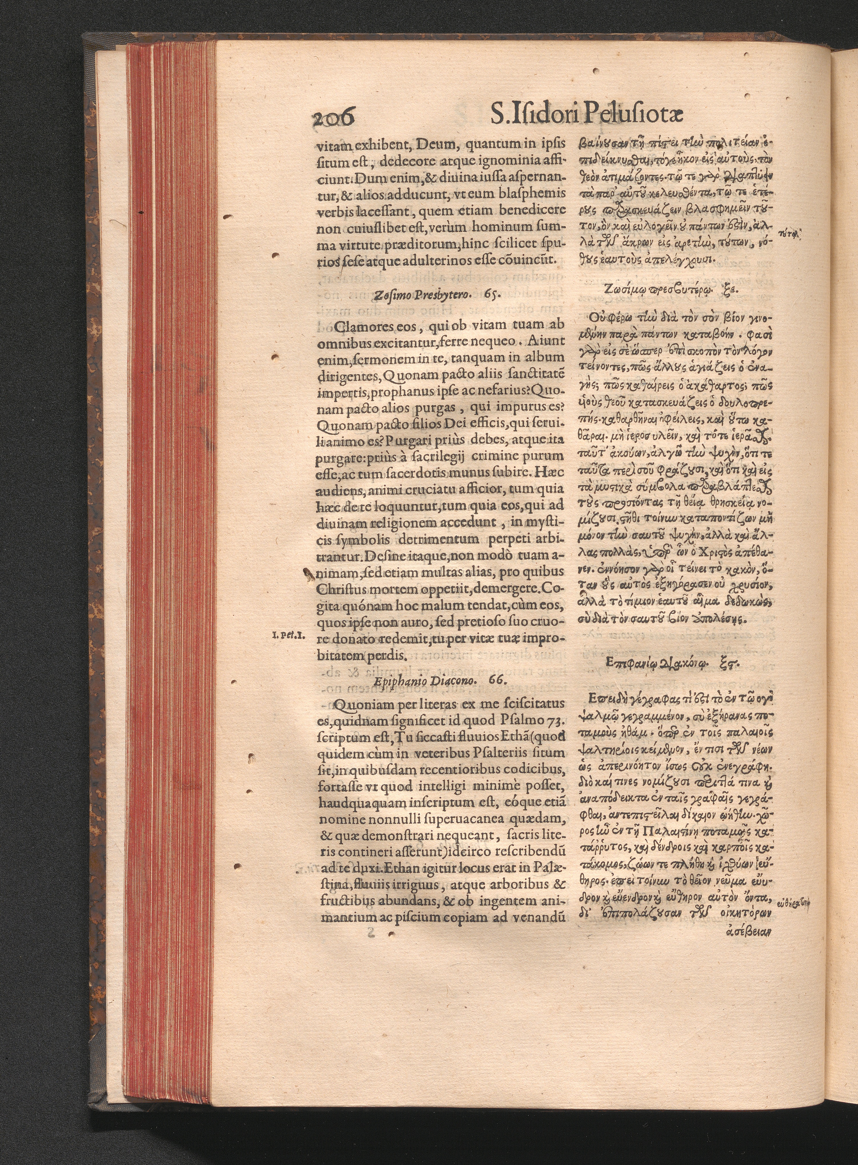Epistolai tu hagiu Isidōru tu Pēlusiōtu / Quibus è regione accessit latina Clariss. viri Iacobi Billii Prunęi, S. Michaëlis in Eremo quondam Cœnobiarchæ, interpretatio