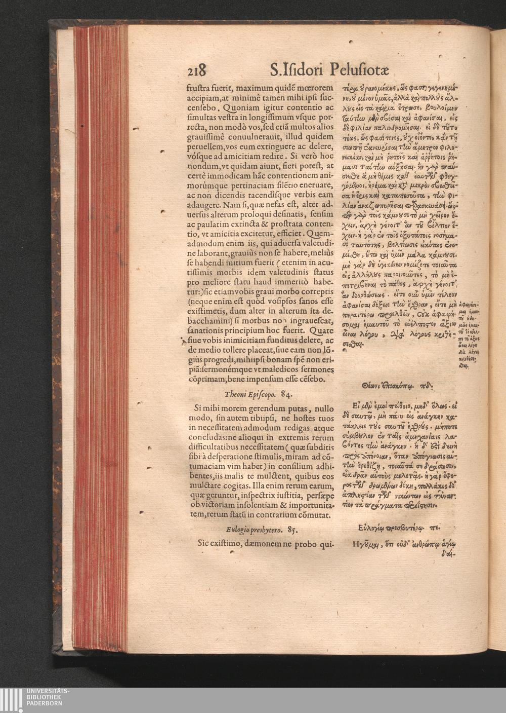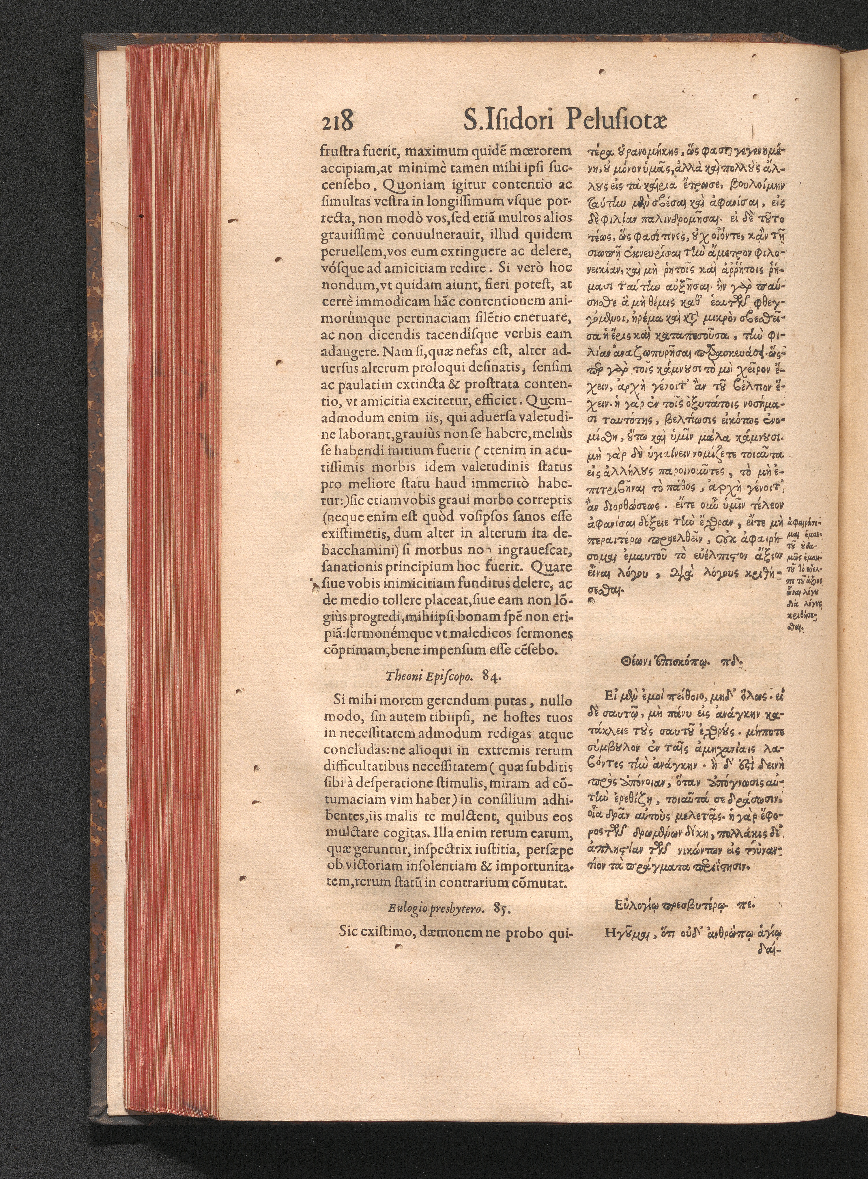 Epistolai tu hagiu Isidōru tu Pēlusiōtu / Quibus è regione accessit latina Clariss. viri Iacobi Billii Prunęi, S. Michaëlis in Eremo quondam Cœnobiarchæ, interpretatio