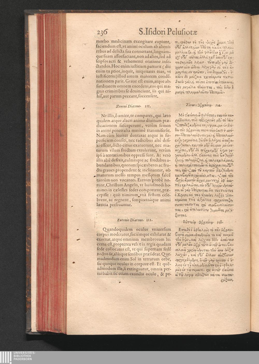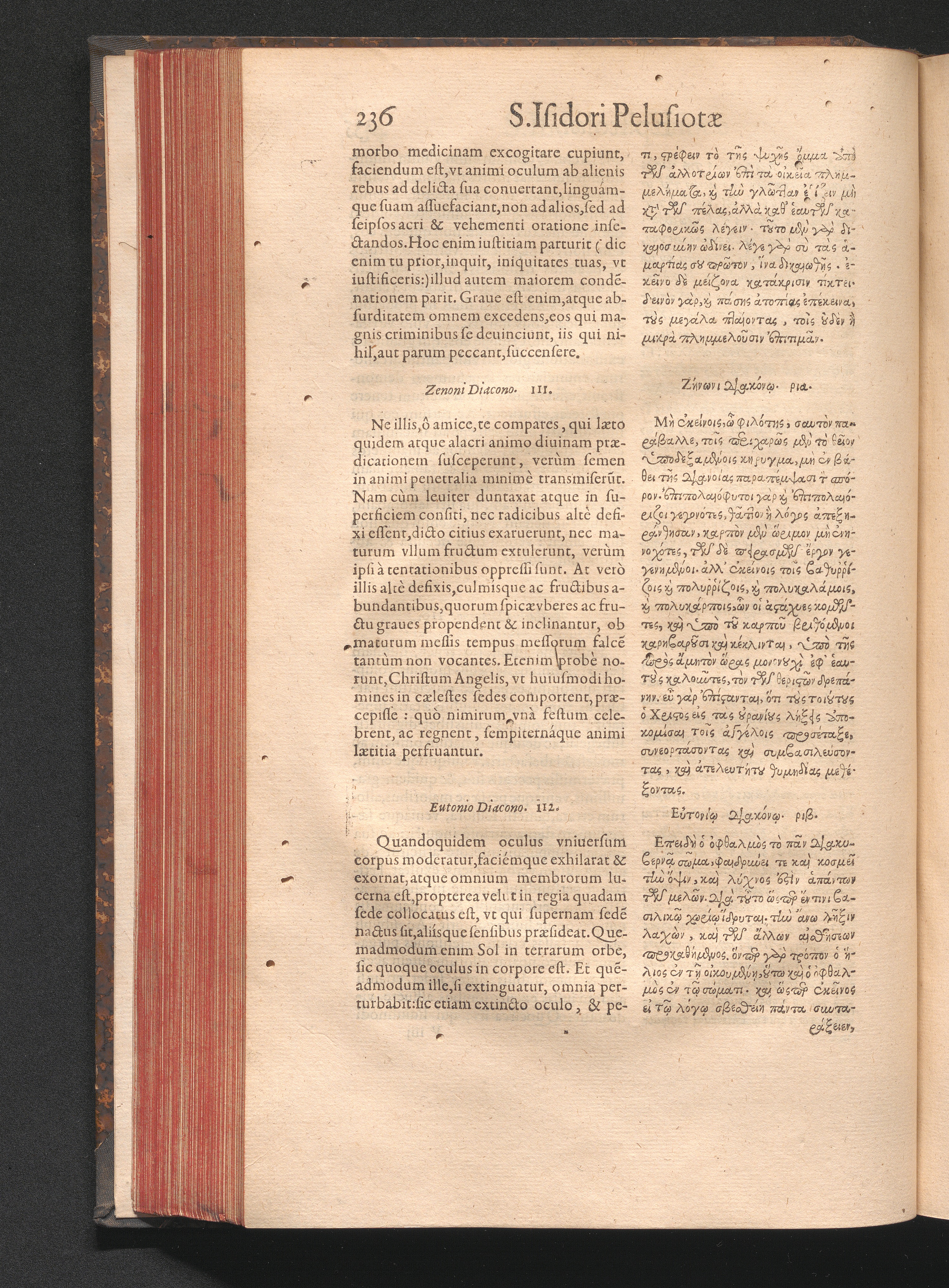 Epistolai tu hagiu Isidōru tu Pēlusiōtu / Quibus è regione accessit latina Clariss. viri Iacobi Billii Prunęi, S. Michaëlis in Eremo quondam Cœnobiarchæ, interpretatio