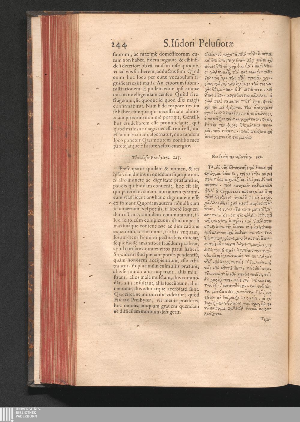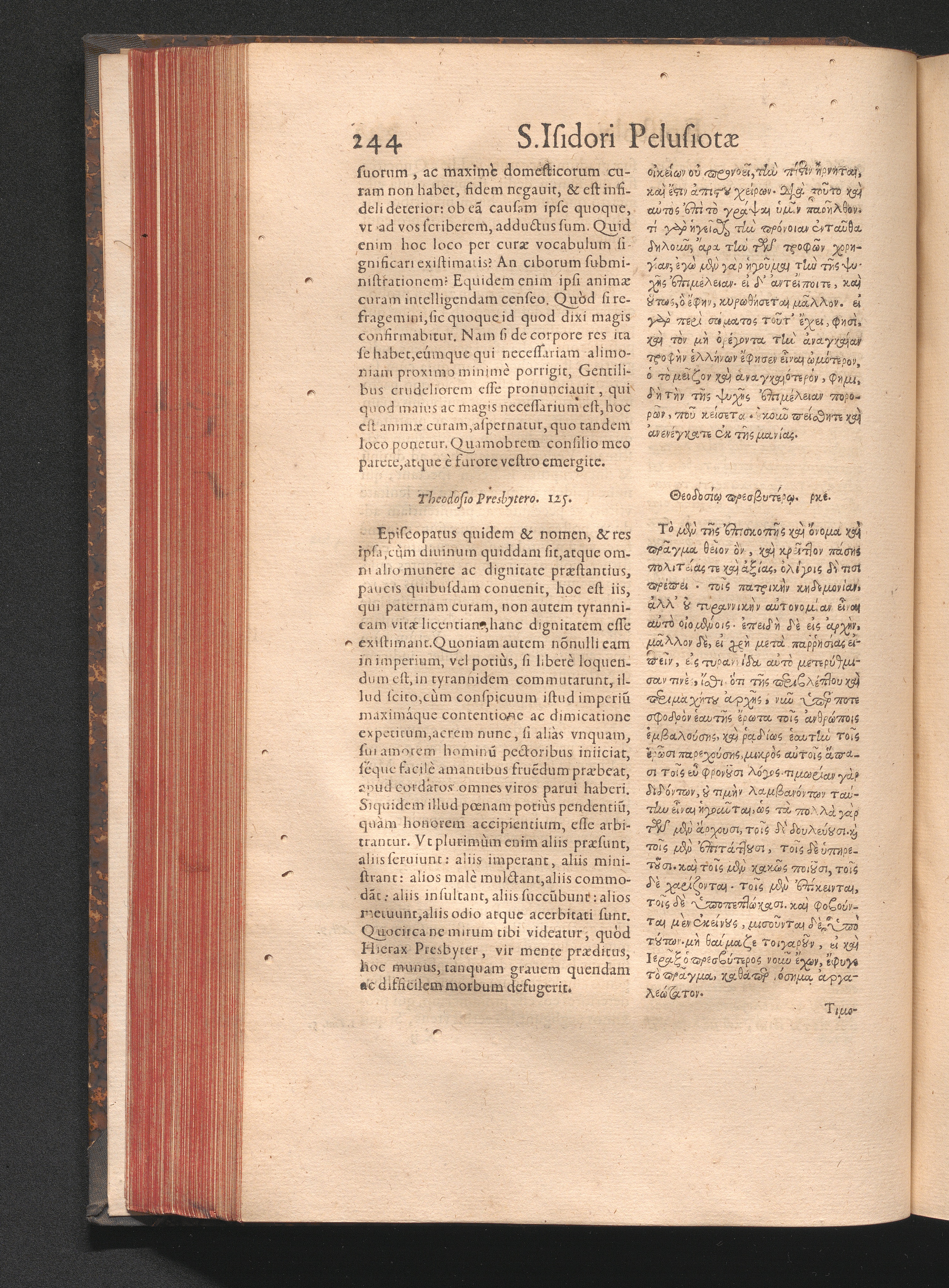 Epistolai tu hagiu Isidōru tu Pēlusiōtu / Quibus è regione accessit latina Clariss. viri Iacobi Billii Prunęi, S. Michaëlis in Eremo quondam Cœnobiarchæ, interpretatio