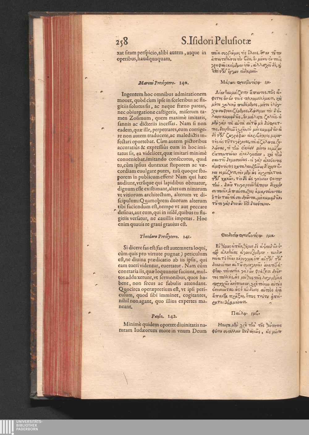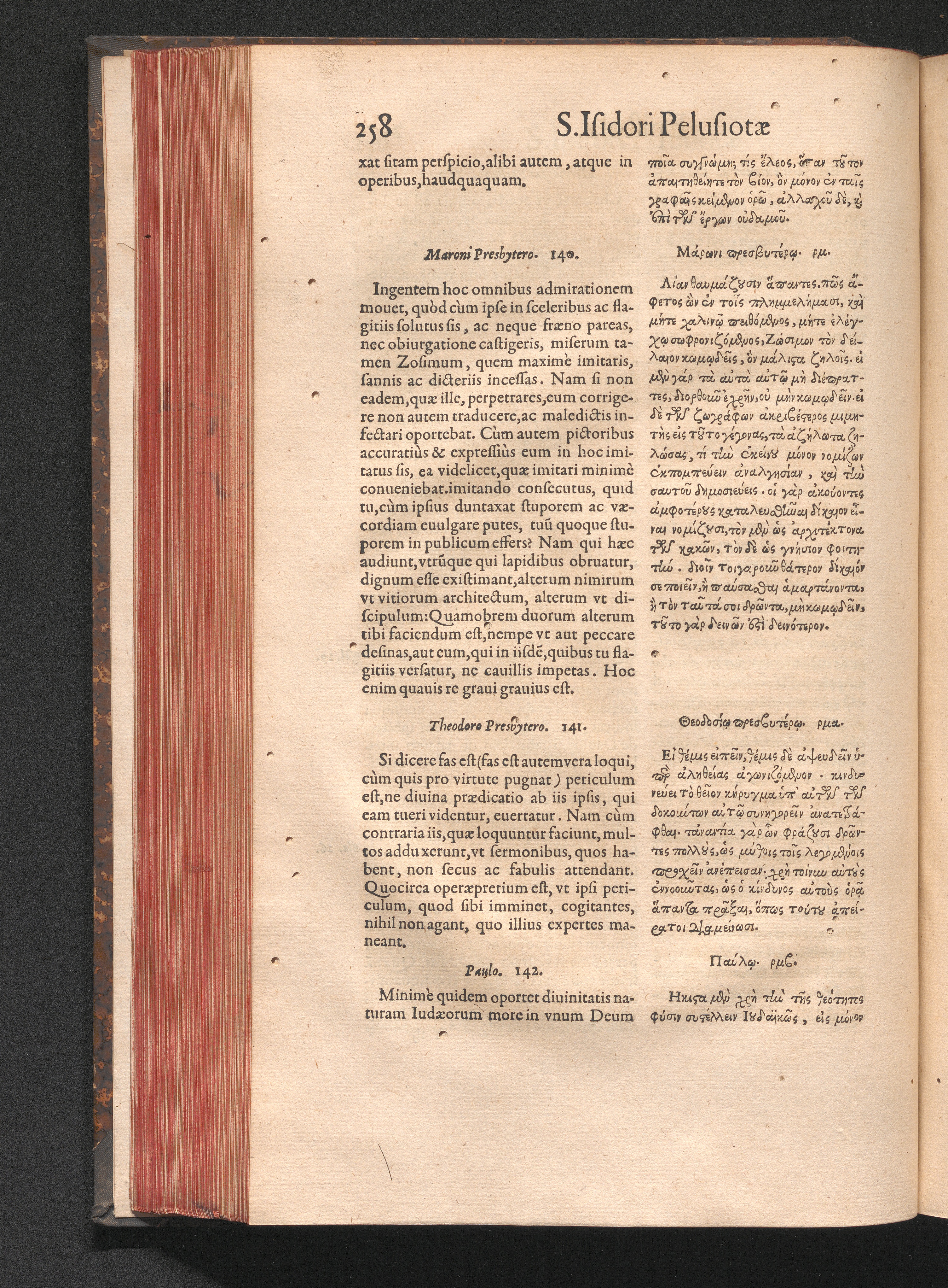Epistolai tu hagiu Isidōru tu Pēlusiōtu / Quibus è regione accessit latina Clariss. viri Iacobi Billii Prunęi, S. Michaëlis in Eremo quondam Cœnobiarchæ, interpretatio