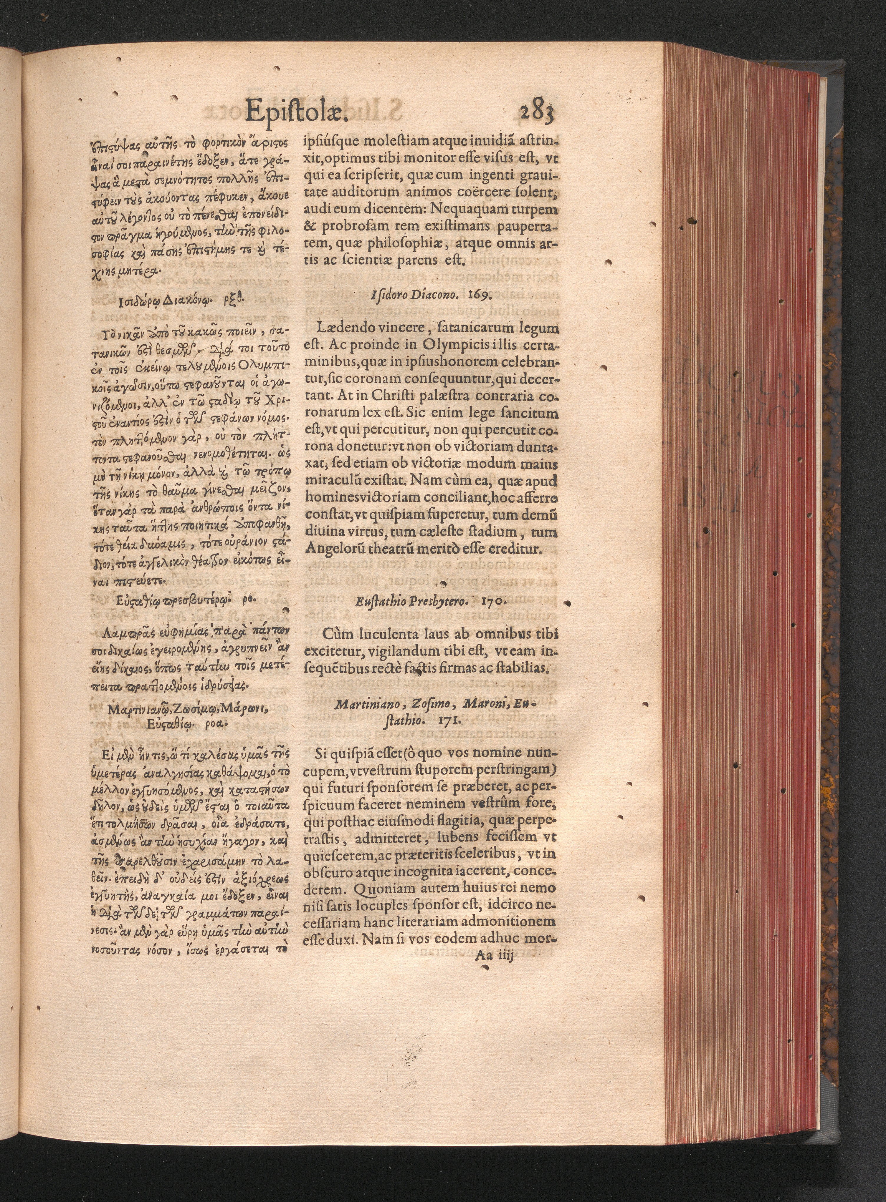 Epistolai tu hagiu Isidōru tu Pēlusiōtu / Quibus è regione accessit latina Clariss. viri Iacobi Billii Prunęi, S. Michaëlis in Eremo quondam Cœnobiarchæ, interpretatio
