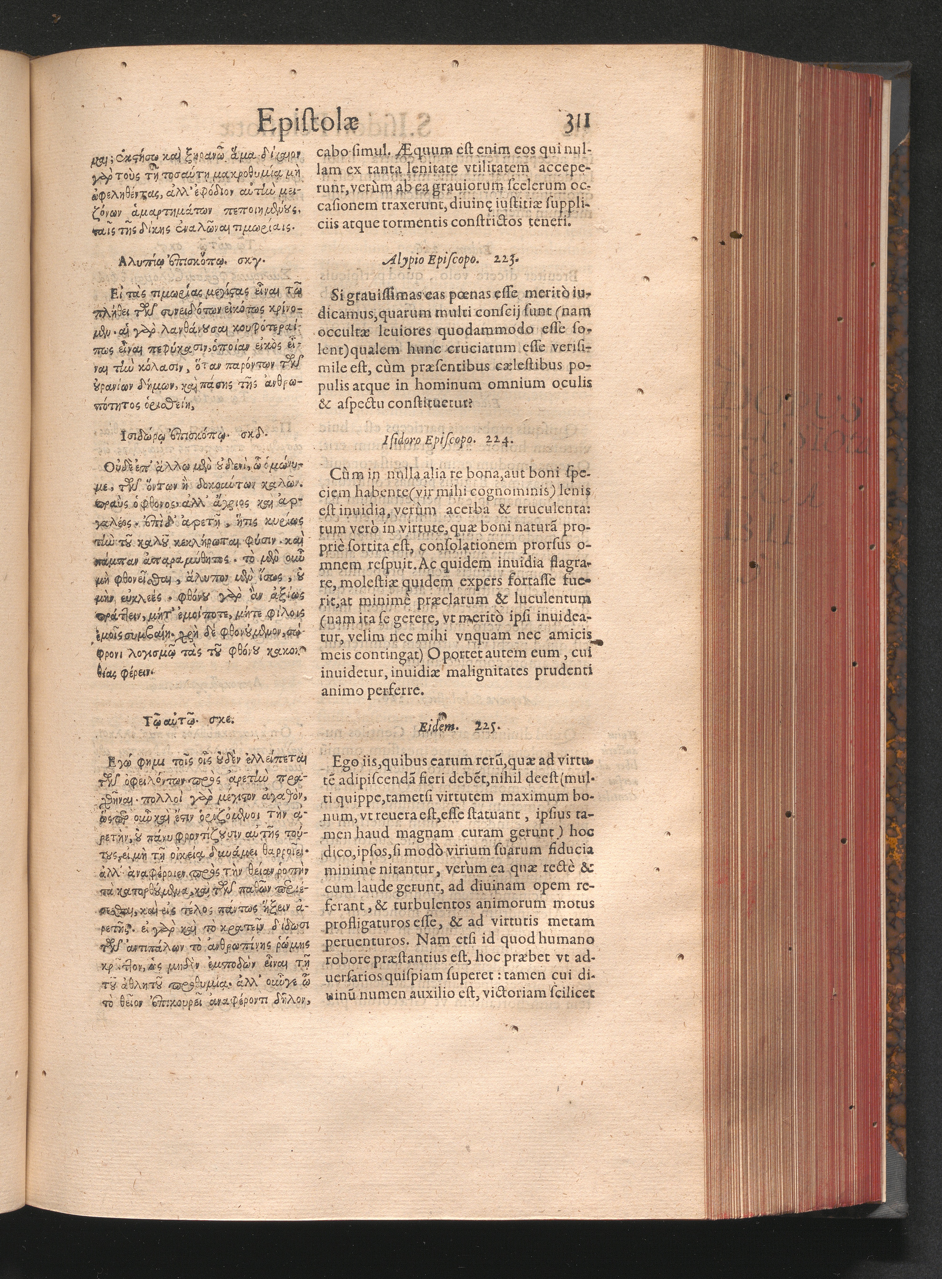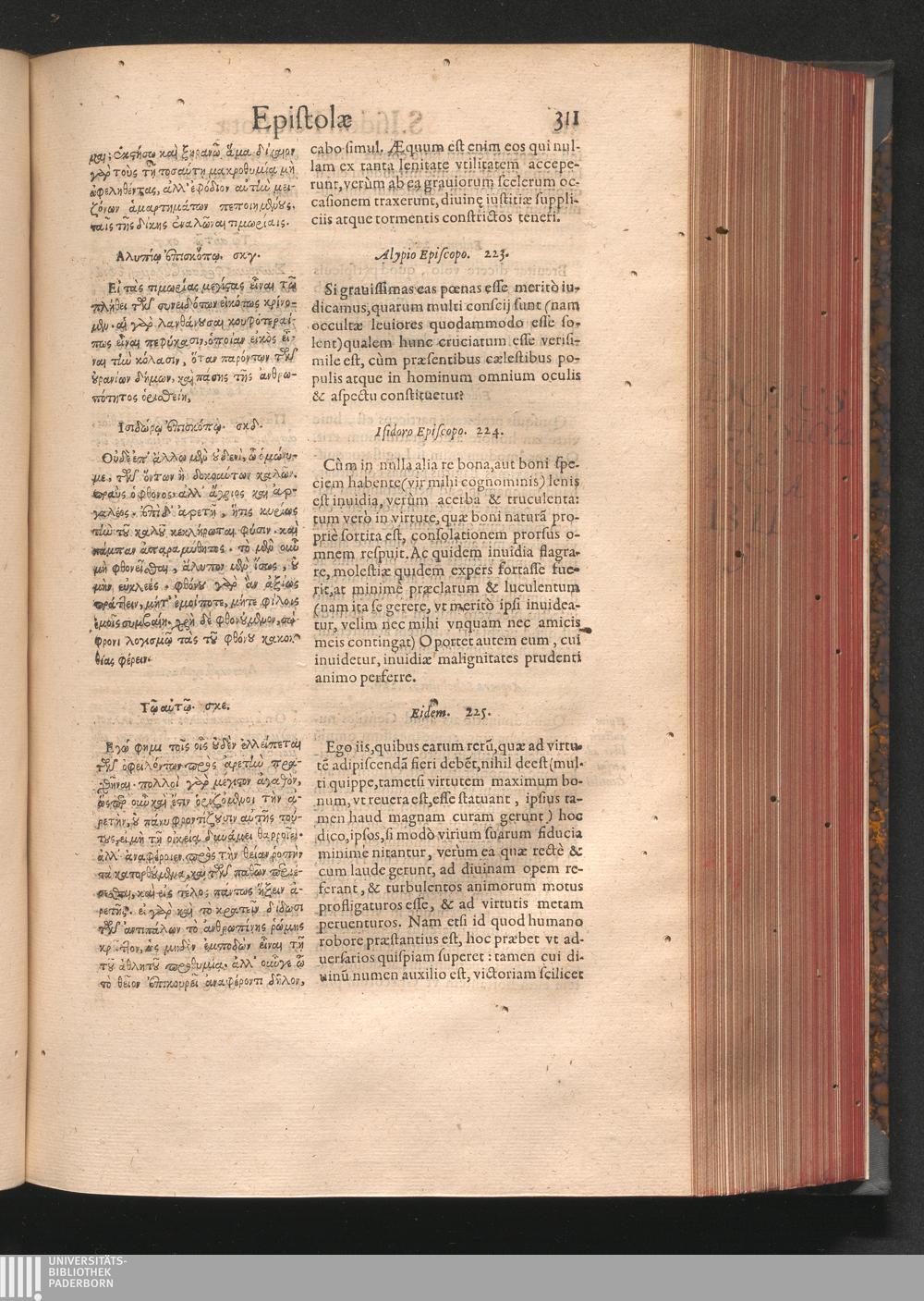 Epistolai tu hagiu Isidōru tu Pēlusiōtu / Quibus è regione accessit latina Clariss. viri Iacobi Billii Prunęi, S. Michaëlis in Eremo quondam Cœnobiarchæ, interpretatio