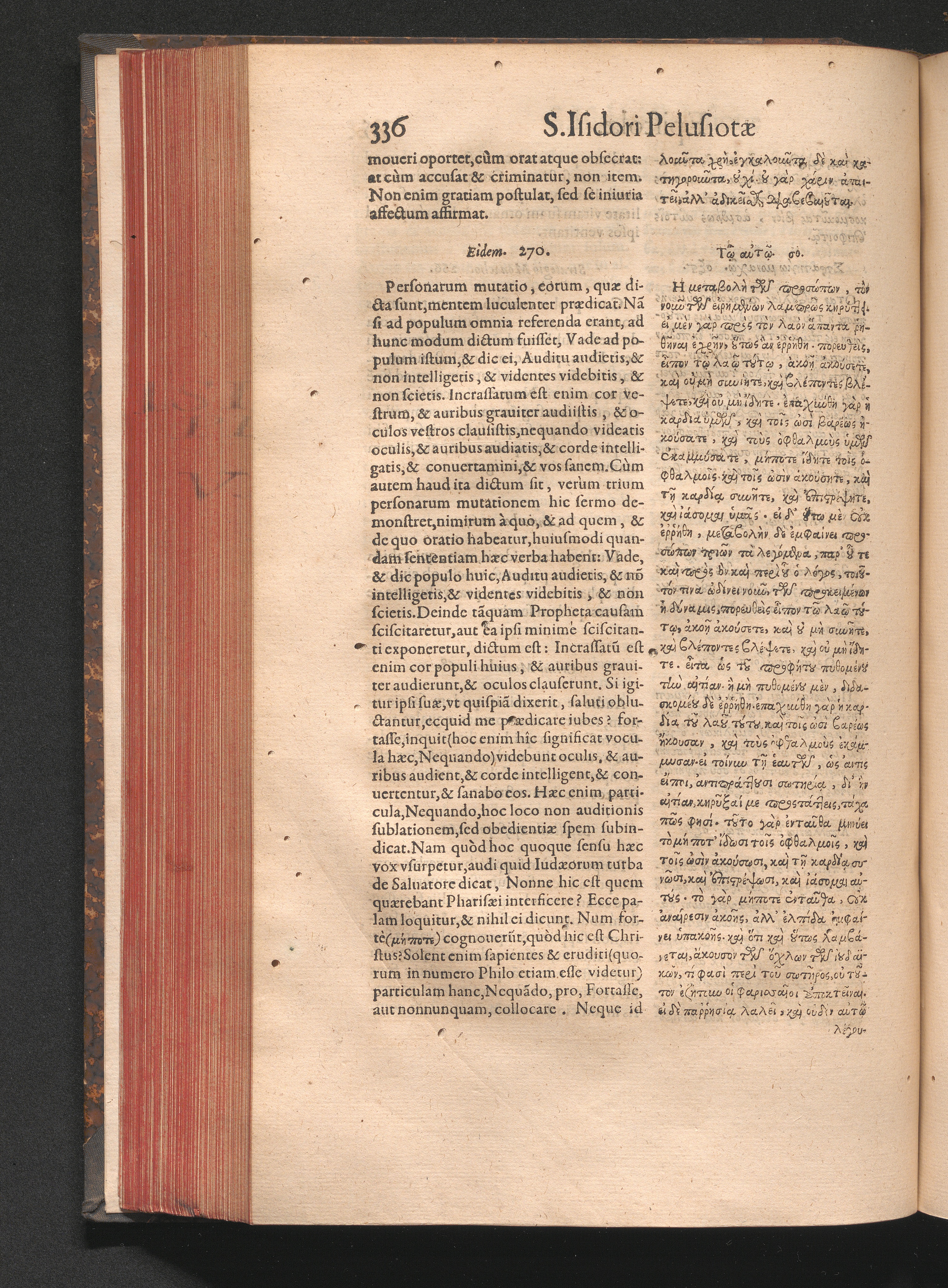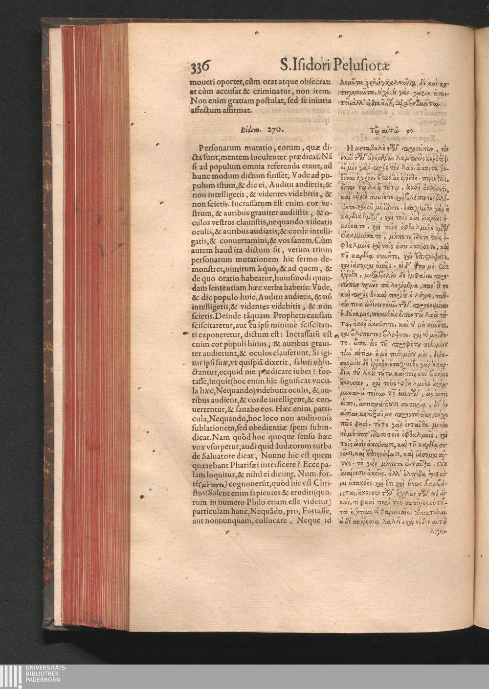 Epistolai tu hagiu Isidōru tu Pēlusiōtu / Quibus è regione accessit latina Clariss. viri Iacobi Billii Prunęi, S. Michaëlis in Eremo quondam Cœnobiarchæ, interpretatio