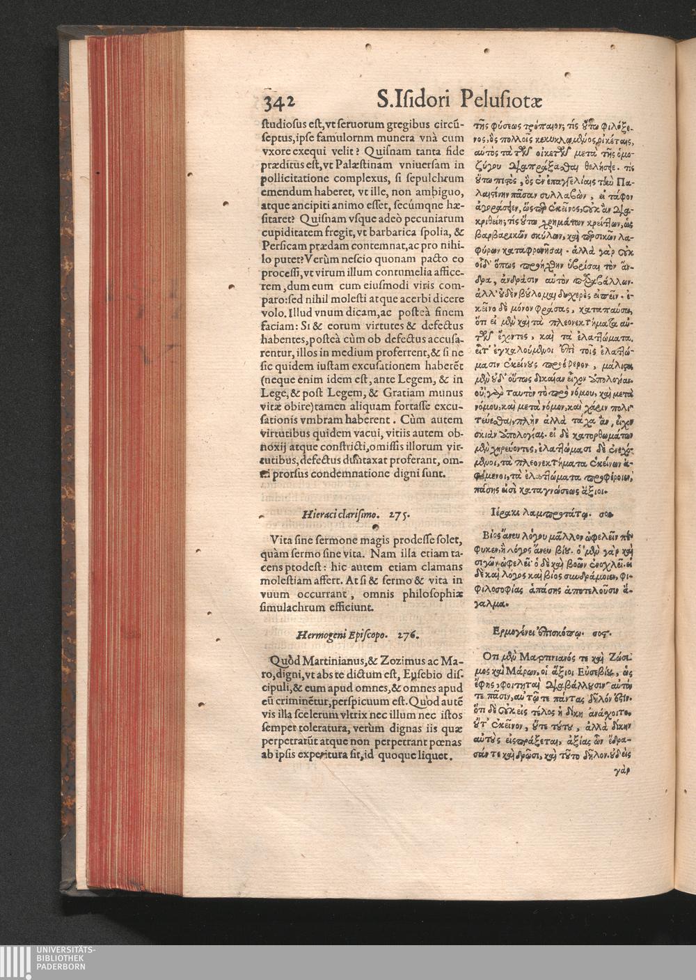 Epistolai tu hagiu Isidōru tu Pēlusiōtu / Quibus è regione accessit latina Clariss. viri Iacobi Billii Prunęi, S. Michaëlis in Eremo quondam Cœnobiarchæ, interpretatio