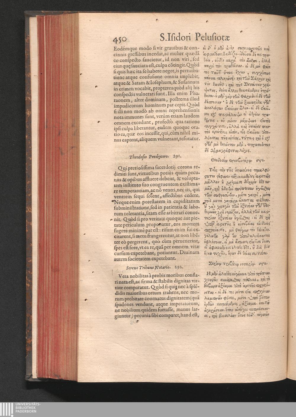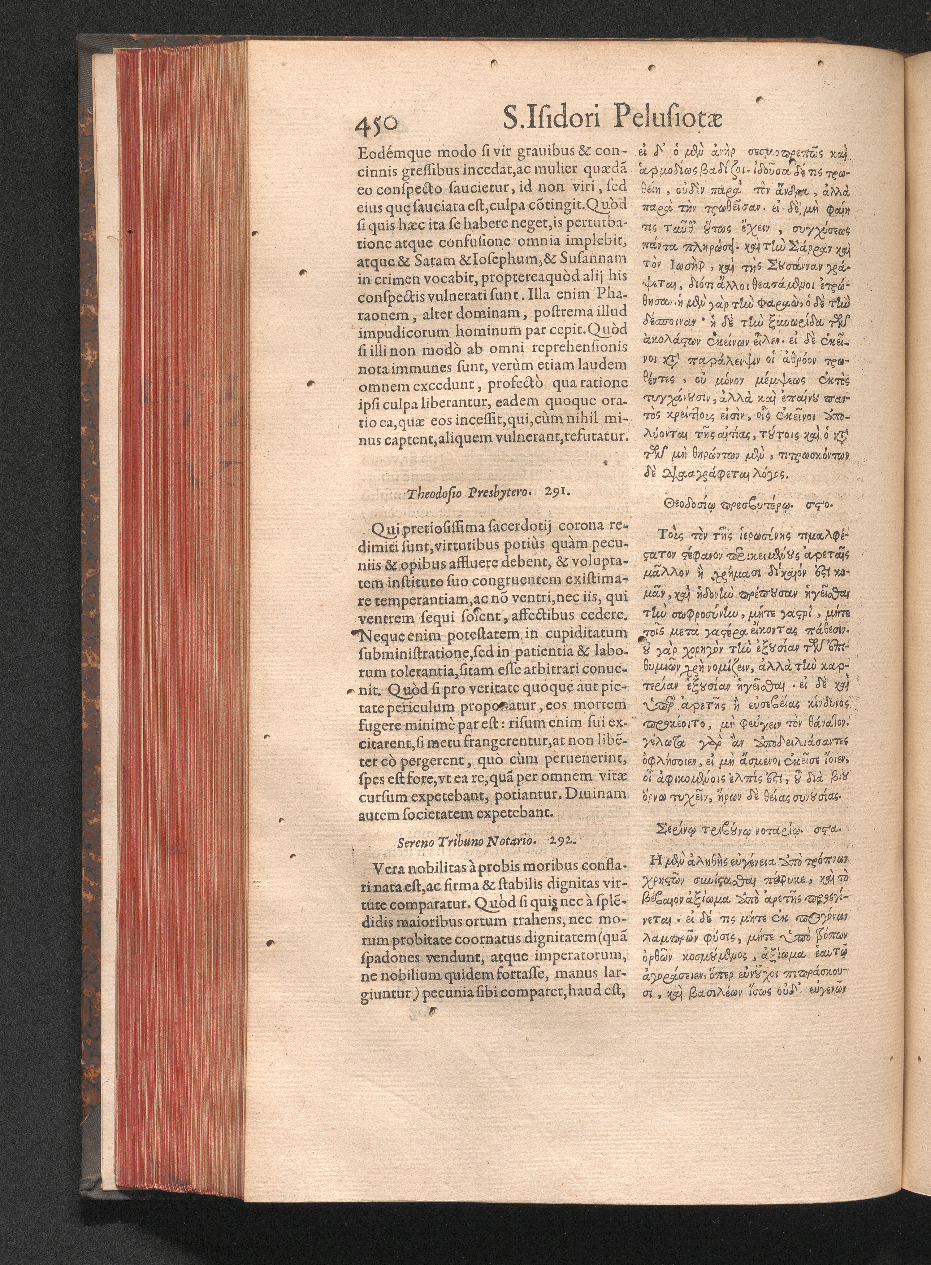 Epistolai tu hagiu Isidōru tu Pēlusiōtu / Quibus è regione accessit latina Clariss. viri Iacobi Billii Prunęi, S. Michaëlis in Eremo quondam Cœnobiarchæ, interpretatio