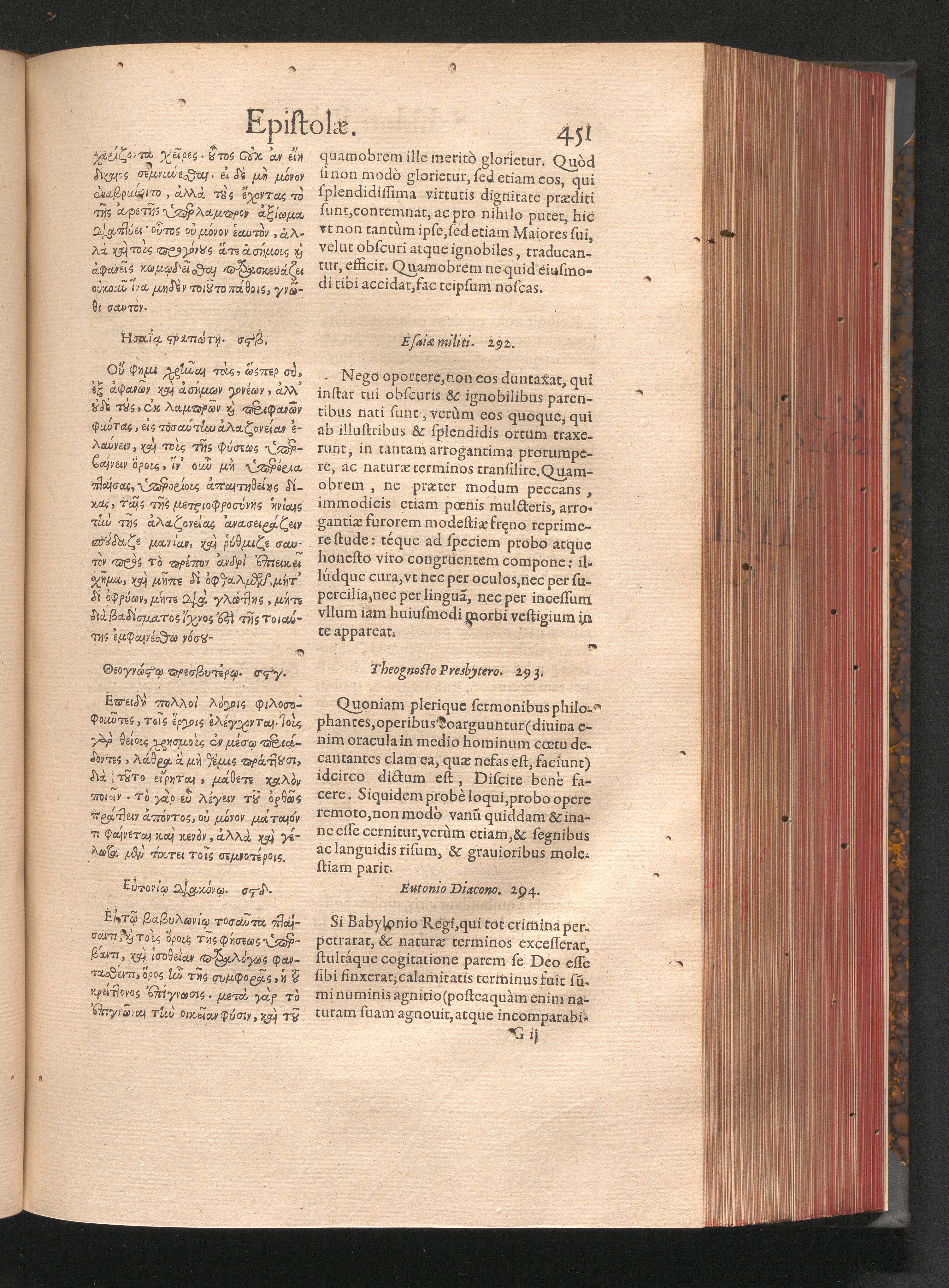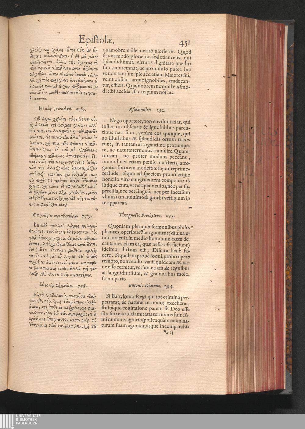 Epistolai tu hagiu Isidōru tu Pēlusiōtu / Quibus è regione accessit latina Clariss. viri Iacobi Billii Prunęi, S. Michaëlis in Eremo quondam Cœnobiarchæ, interpretatio