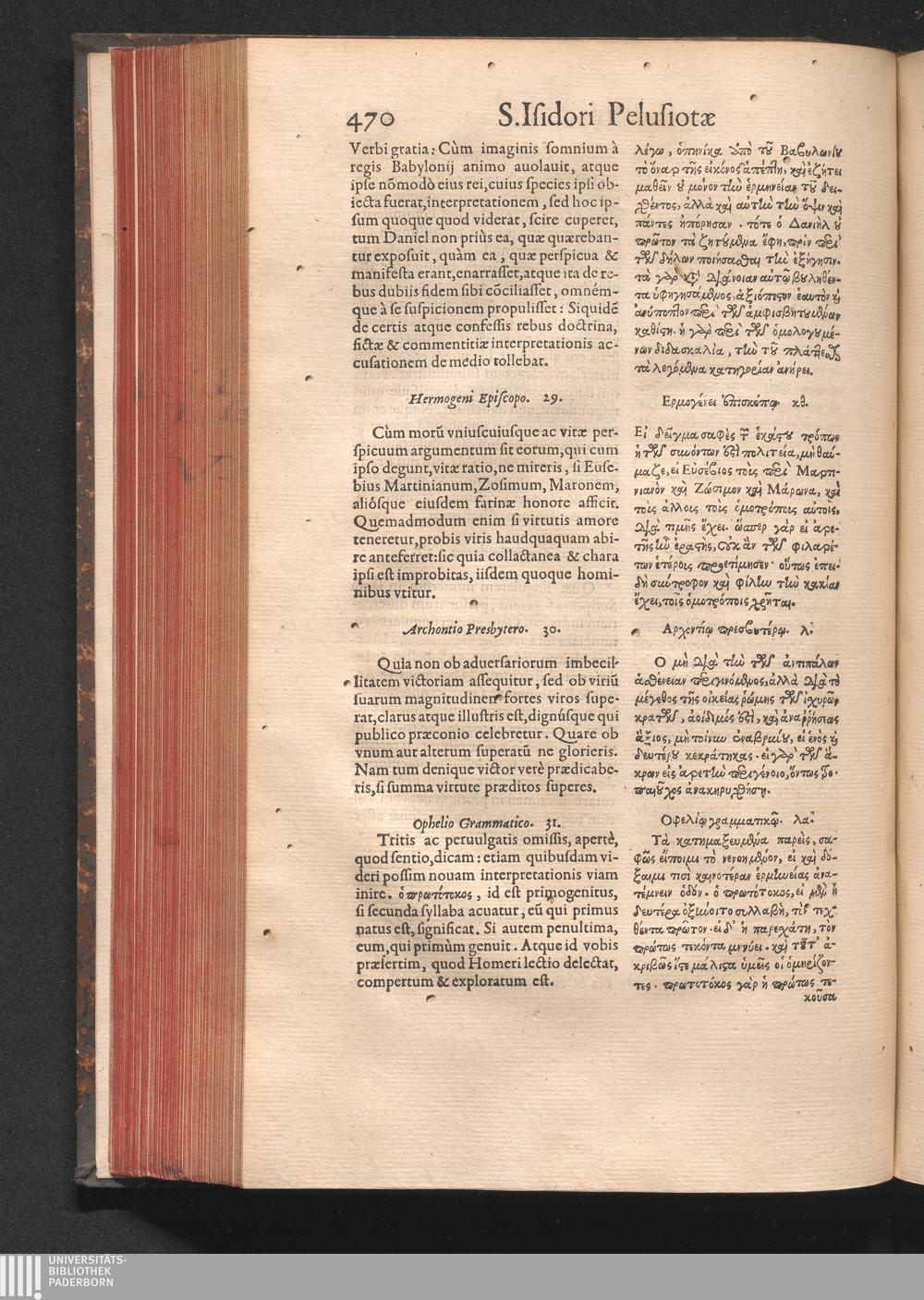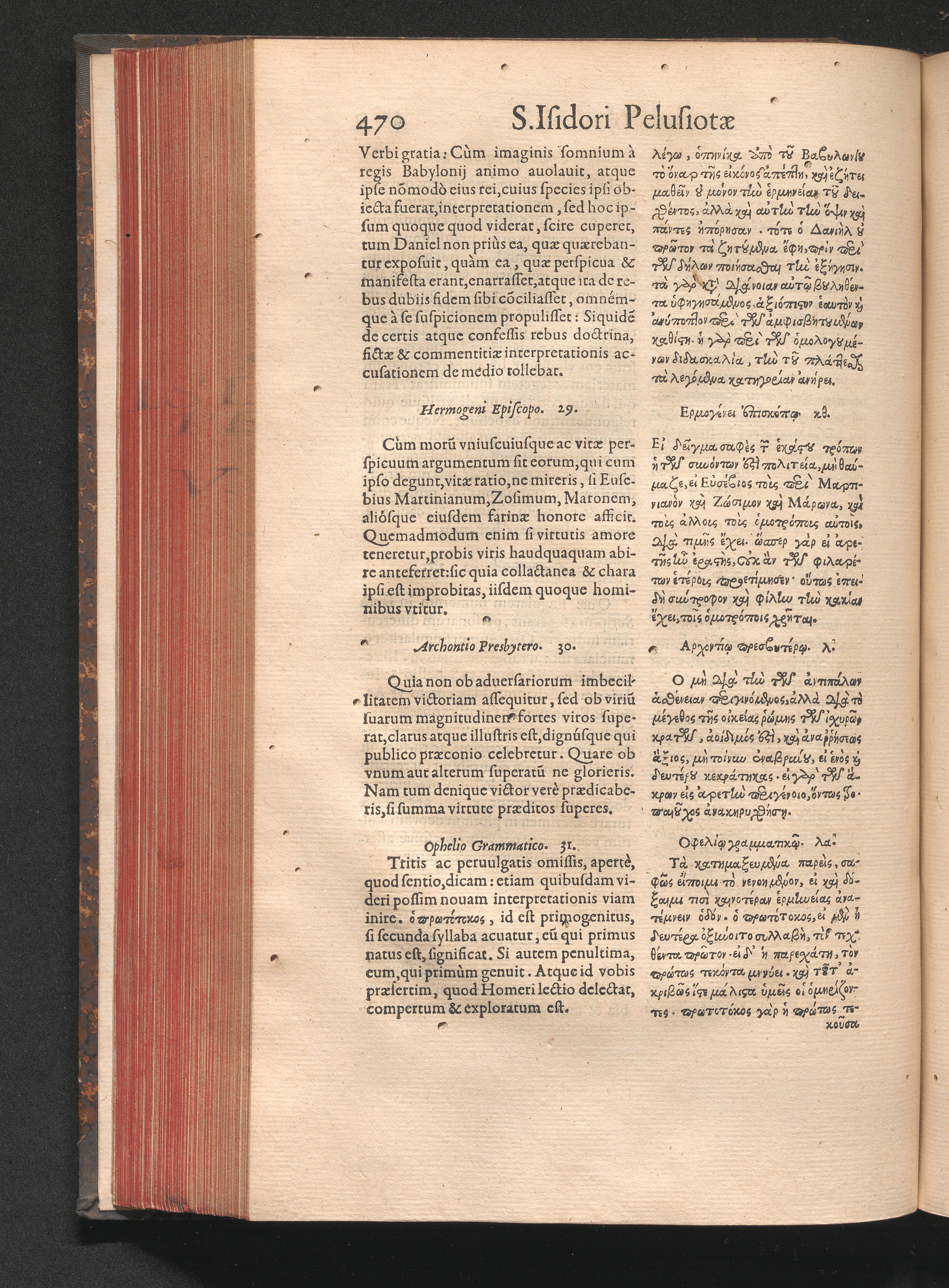 Epistolai tu hagiu Isidōru tu Pēlusiōtu / Quibus è regione accessit latina Clariss. viri Iacobi Billii Prunęi, S. Michaëlis in Eremo quondam Cœnobiarchæ, interpretatio