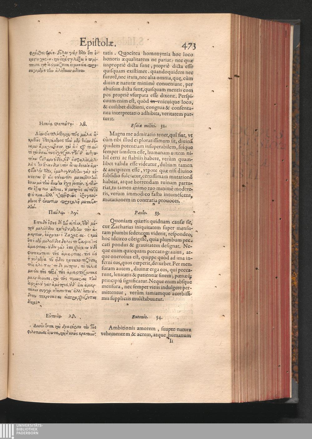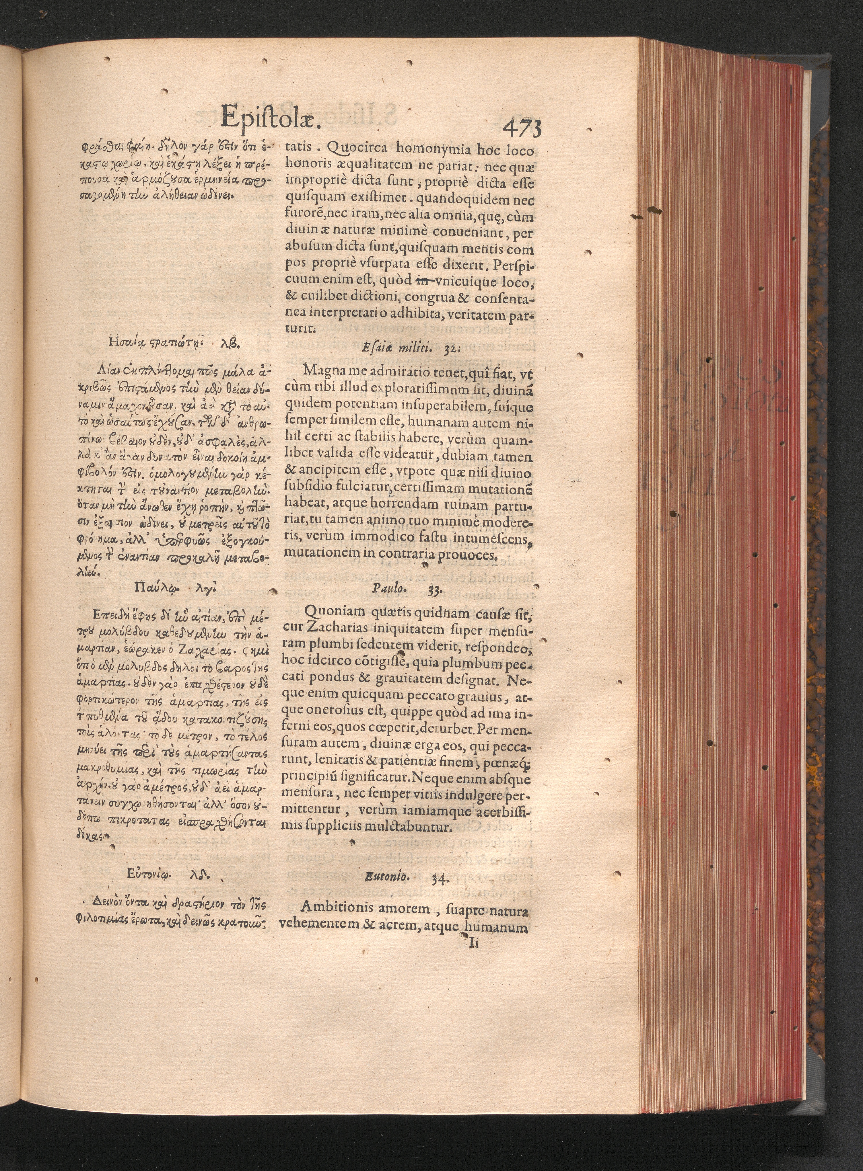 Epistolai tu hagiu Isidōru tu Pēlusiōtu / Quibus è regione accessit latina Clariss. viri Iacobi Billii Prunęi, S. Michaëlis in Eremo quondam Cœnobiarchæ, interpretatio
