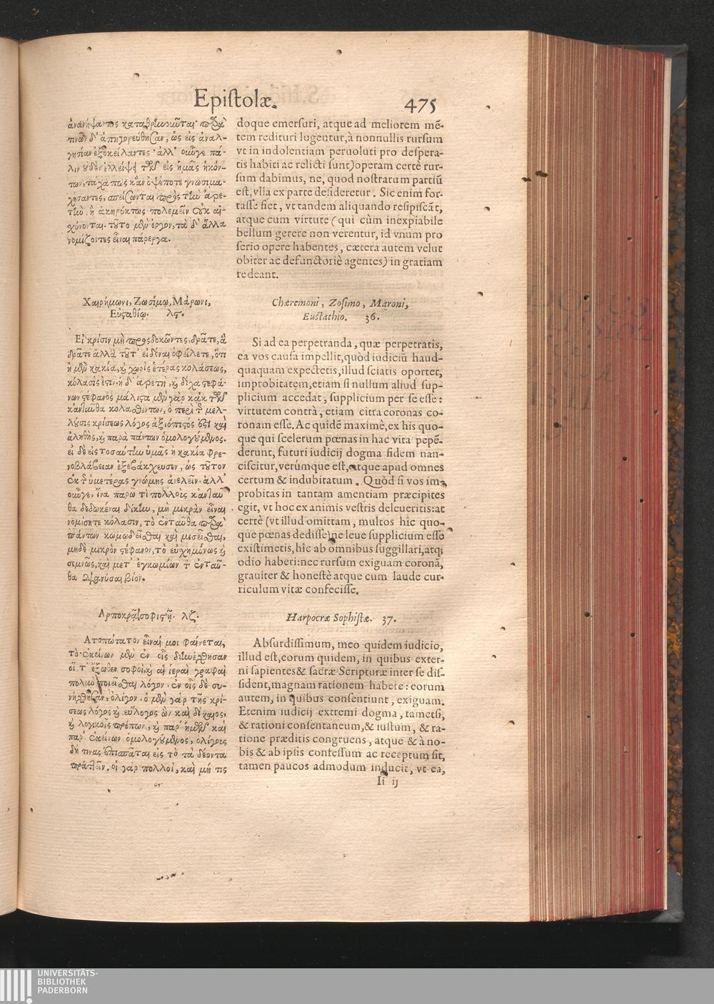 Epistolai tu hagiu Isidōru tu Pēlusiōtu / Quibus è regione accessit latina Clariss. viri Iacobi Billii Prunęi, S. Michaëlis in Eremo quondam Cœnobiarchæ, interpretatio