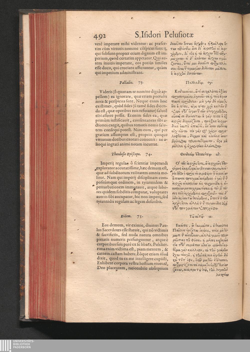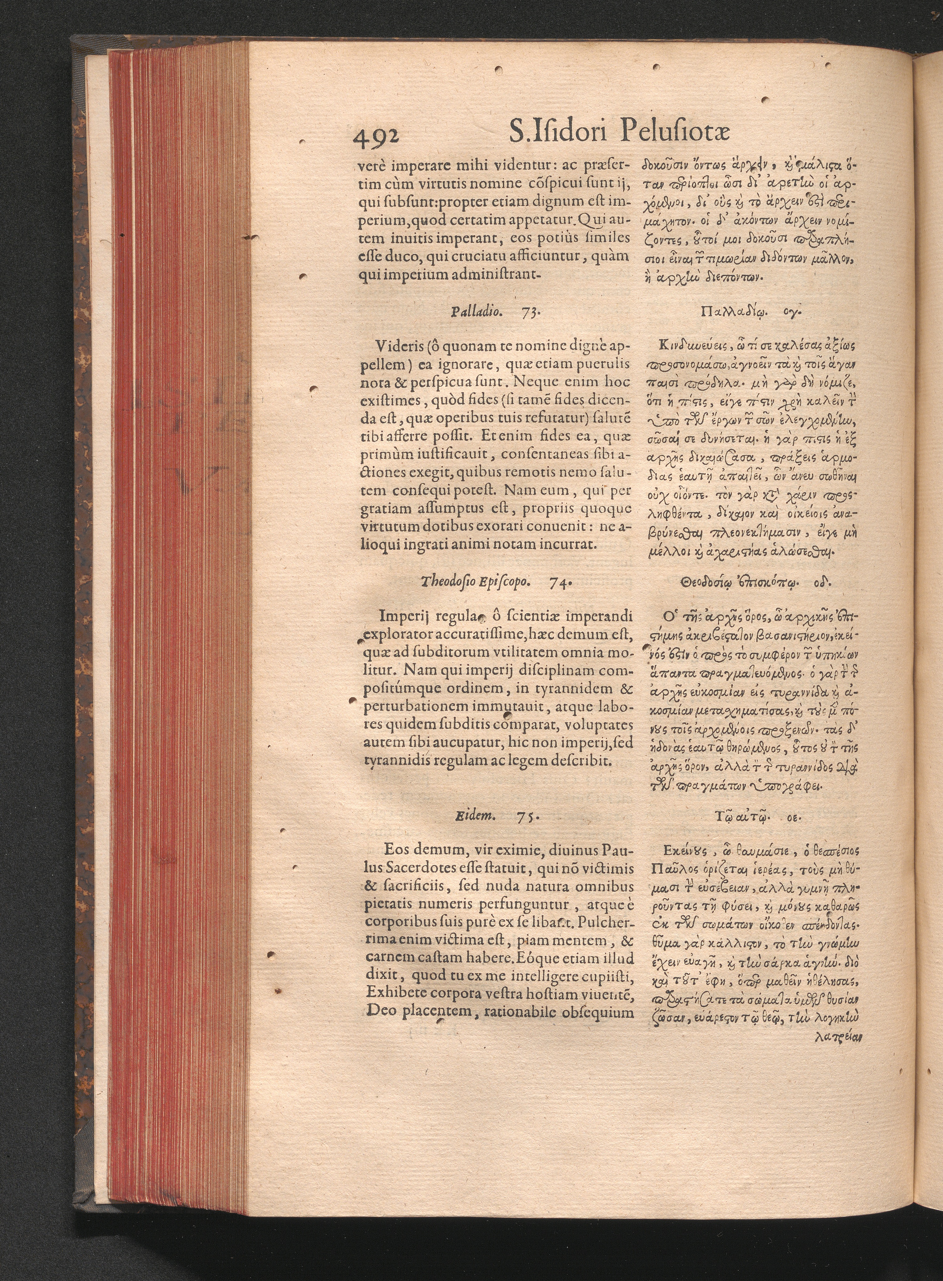 Epistolai tu hagiu Isidōru tu Pēlusiōtu / Quibus è regione accessit latina Clariss. viri Iacobi Billii Prunęi, S. Michaëlis in Eremo quondam Cœnobiarchæ, interpretatio