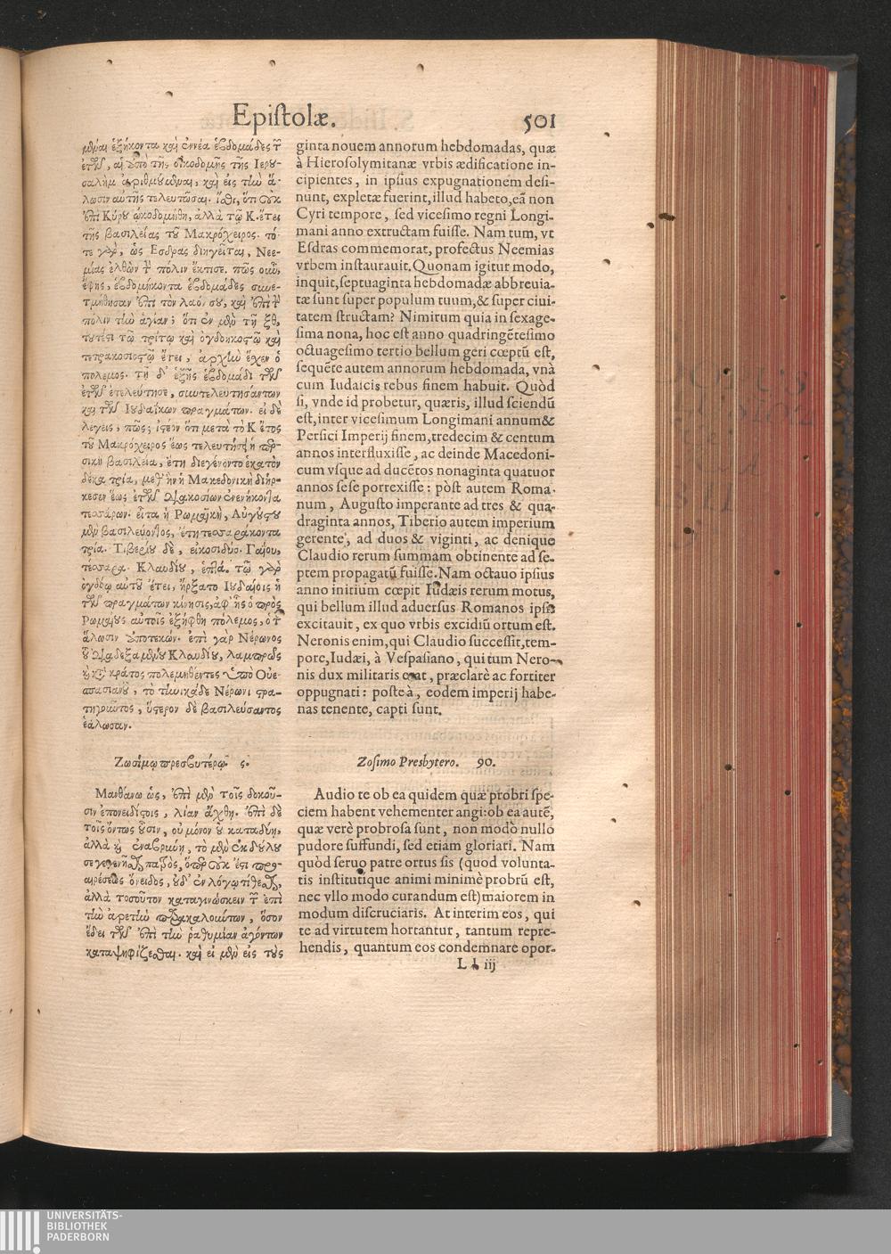 Epistolai tu hagiu Isidōru tu Pēlusiōtu / Quibus è regione accessit latina Clariss. viri Iacobi Billii Prunęi, S. Michaëlis in Eremo quondam Cœnobiarchæ, interpretatio