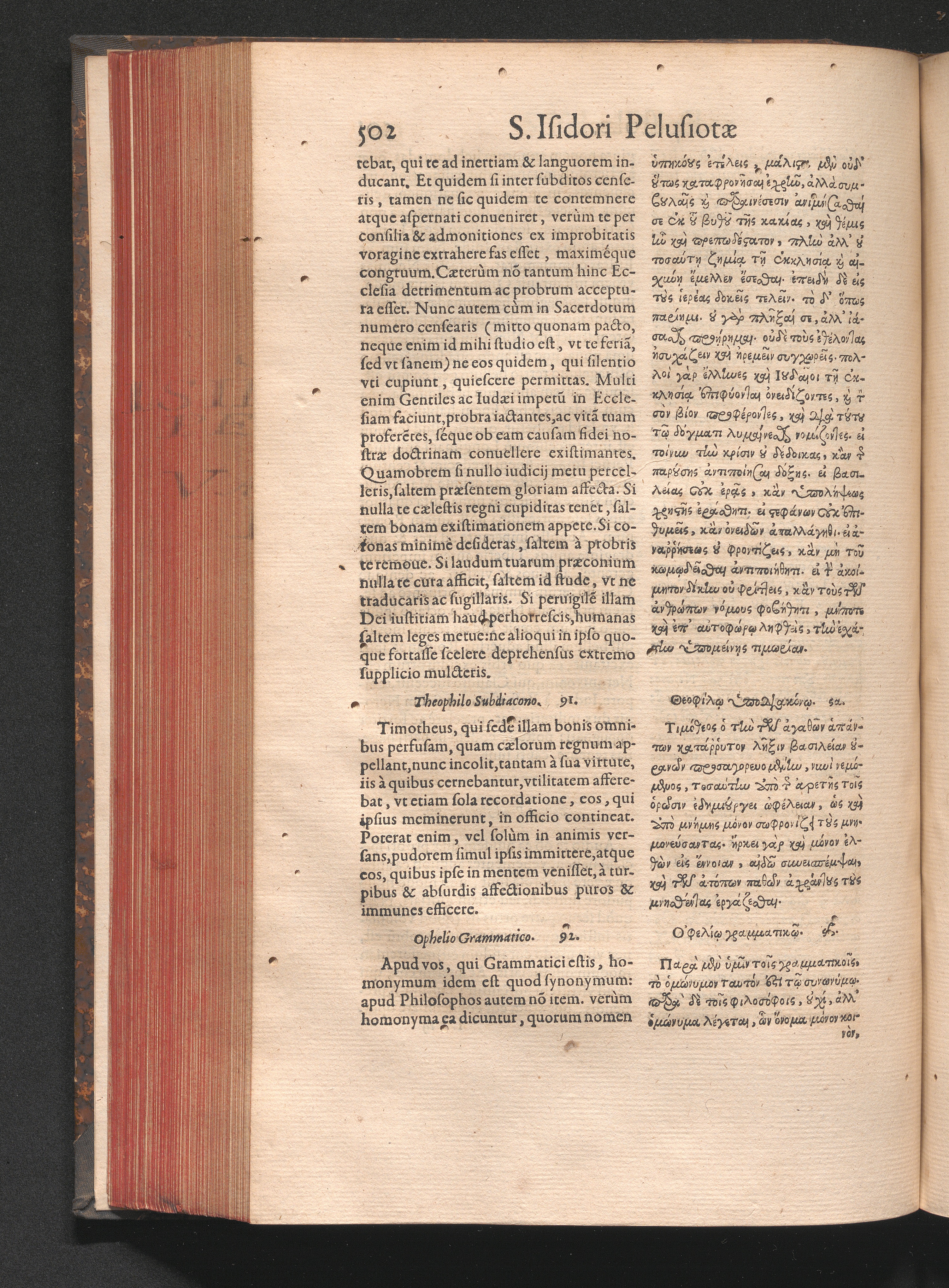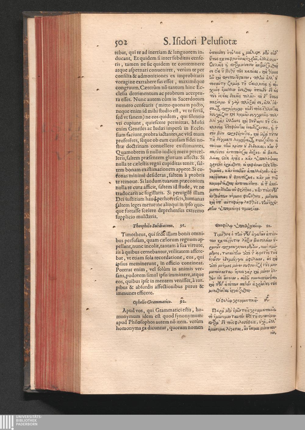 Epistolai tu hagiu Isidōru tu Pēlusiōtu / Quibus è regione accessit latina Clariss. viri Iacobi Billii Prunęi, S. Michaëlis in Eremo quondam Cœnobiarchæ, interpretatio